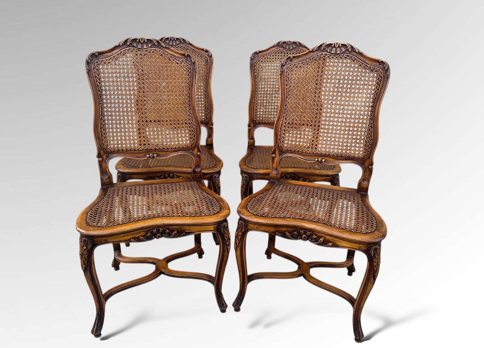 A beautiful and authentic set of four French dining chairs, crafted in the Louis XV style, featuring elegant carved frames with floral carvings, cane seats and backs supported by graceful cabriole legs.