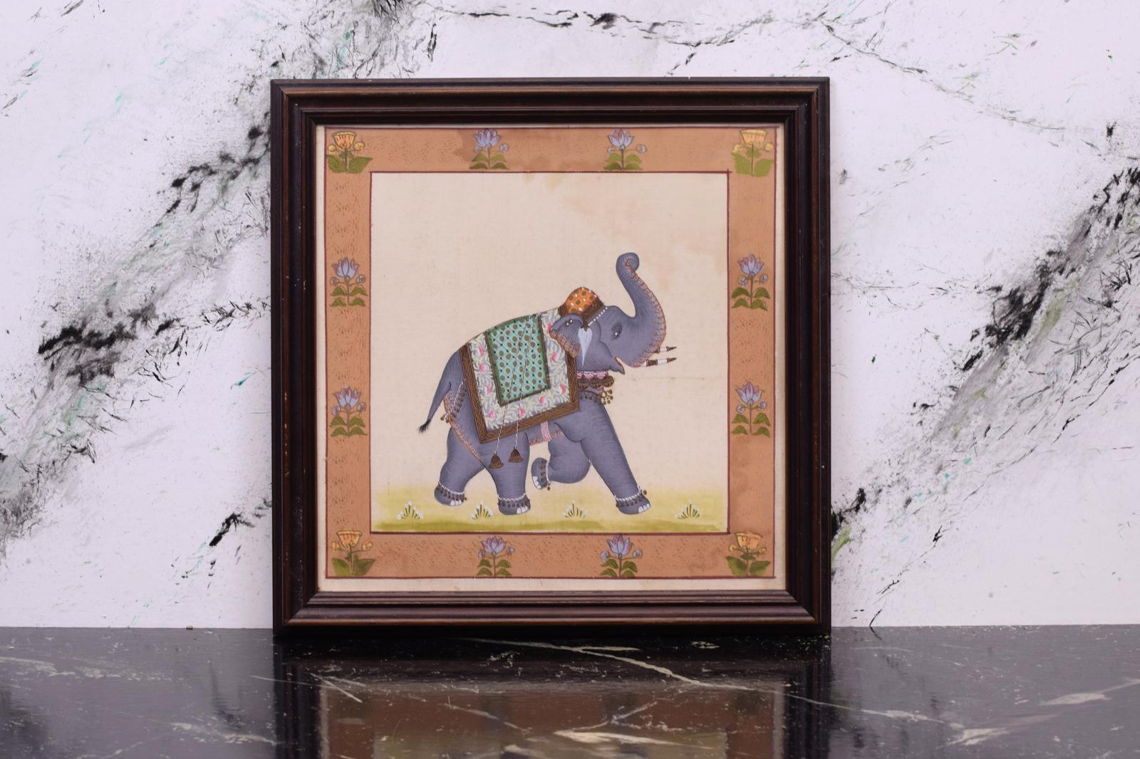 Original Indian Watercolour, Elephant Dressed in Green Stood, Framed and Glazed