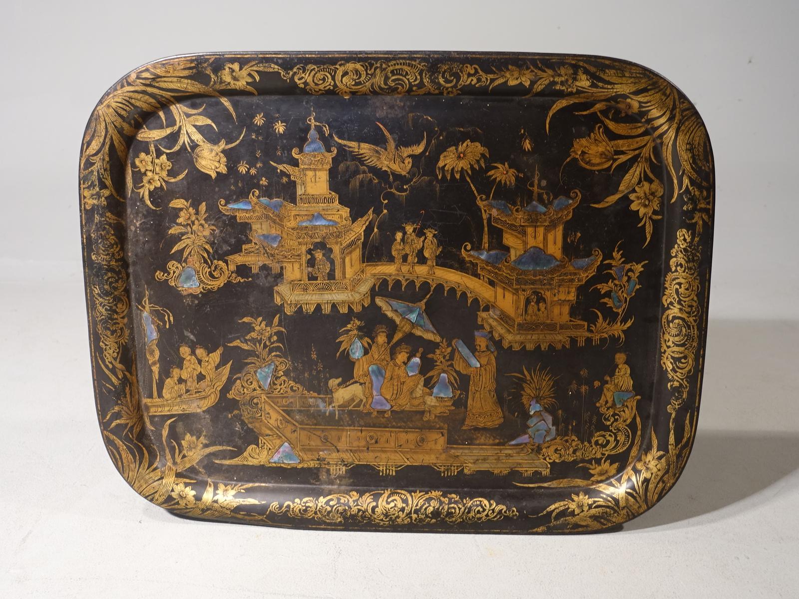 Original Late Regency Tole Tray with Gilded Chinoiserie Decoration
