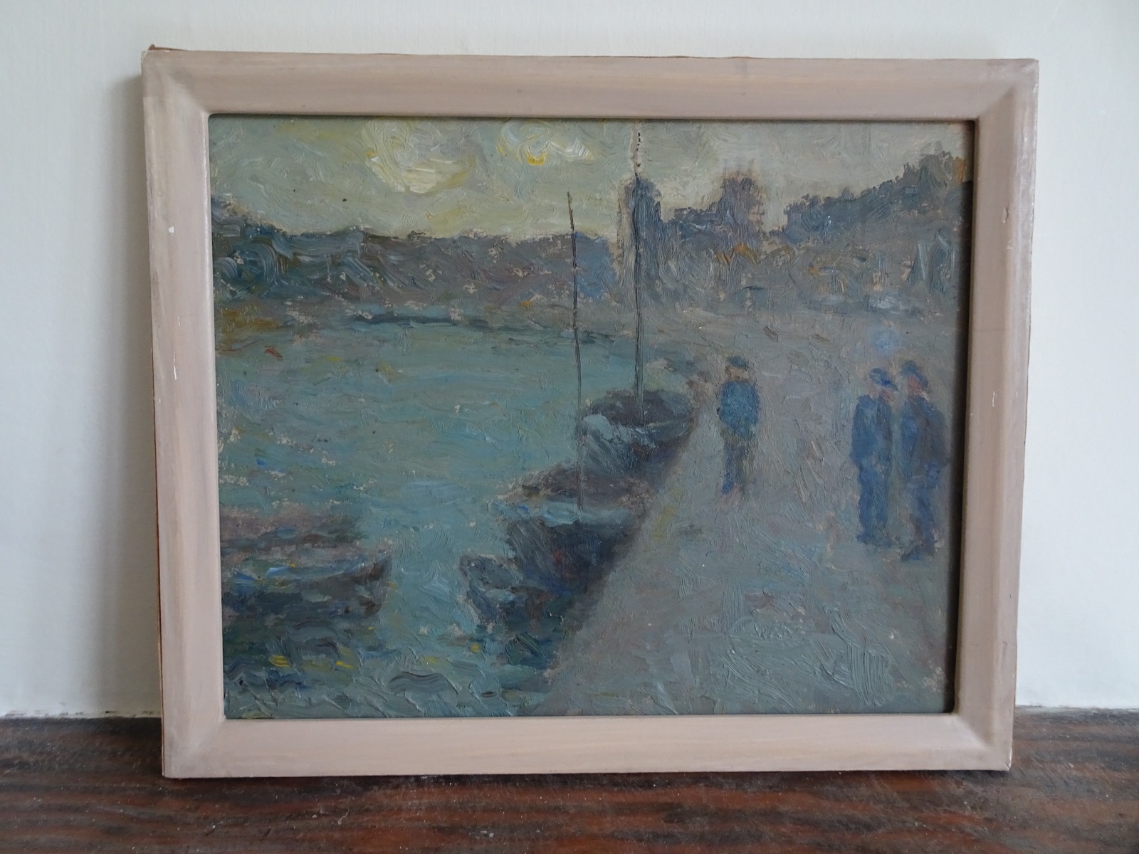 Original Oil on Board 'Figures & Boats at a Harbour' attributed to C. Chapman. Early 20th Century