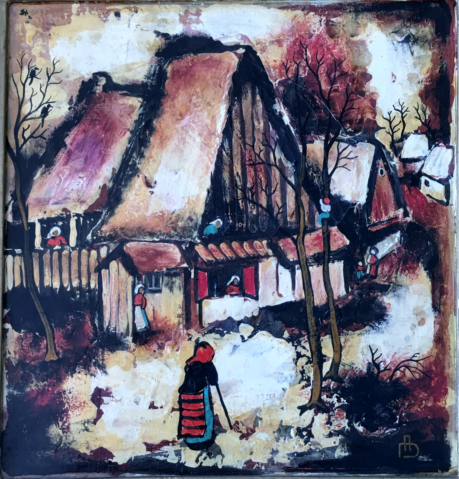 Original Oil On Canvas of a Romanian Village Scene, Monogrammed Ad
