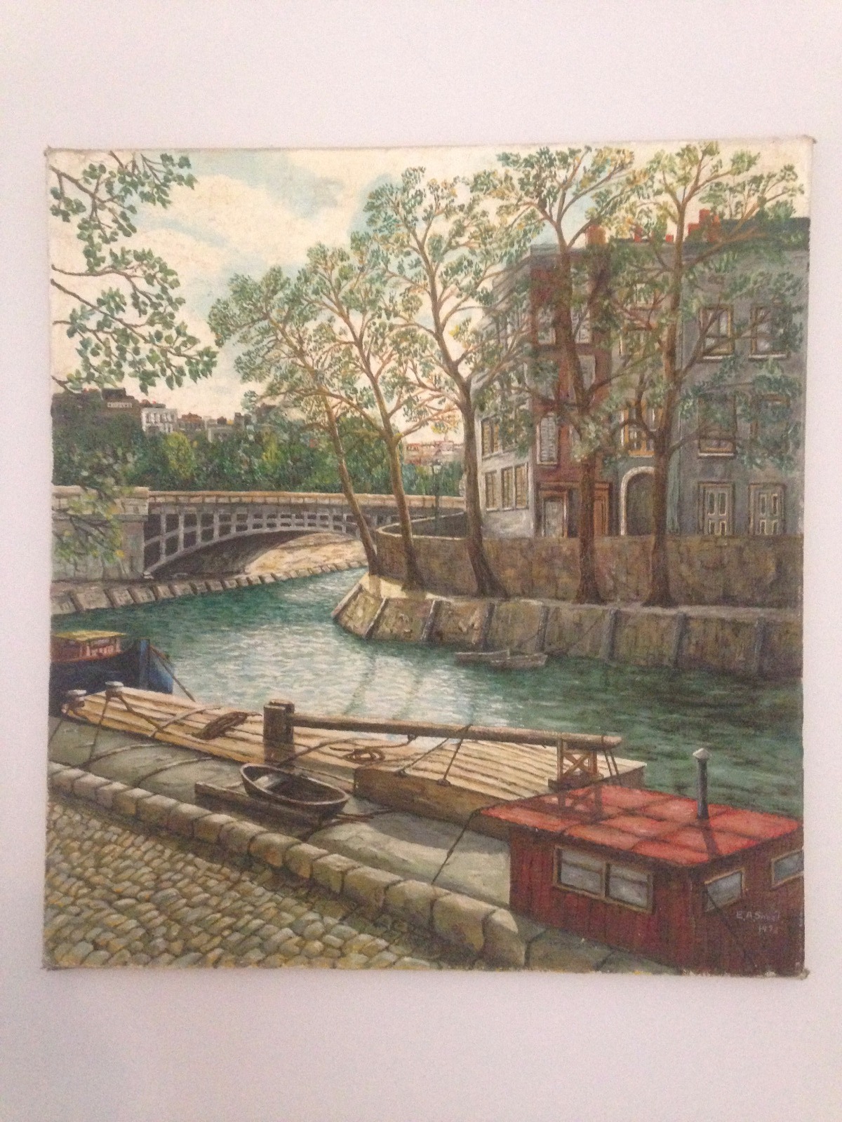 Original Oil Painting On Canvas Landscape Cityscape with Canal Signed & Dated by Artist by E.A.Snoad 1972