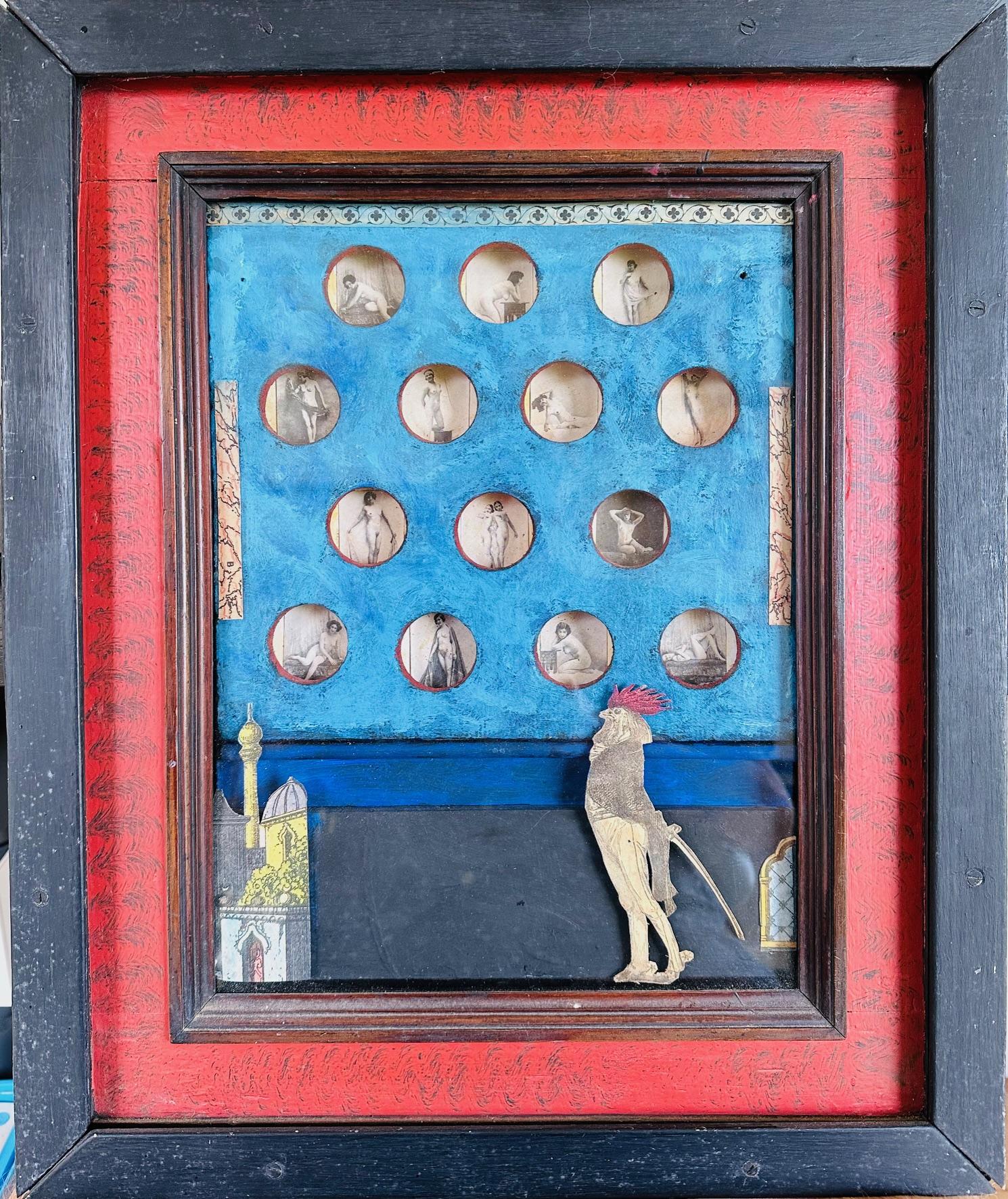 Original Painted Box Construction with Victorian Prints in the Manner of a 'gentlemans Cabinet' by Bill Belcher B.1923. The Work is in a Hand Made Frame, Painted by the Artist. 1980/81