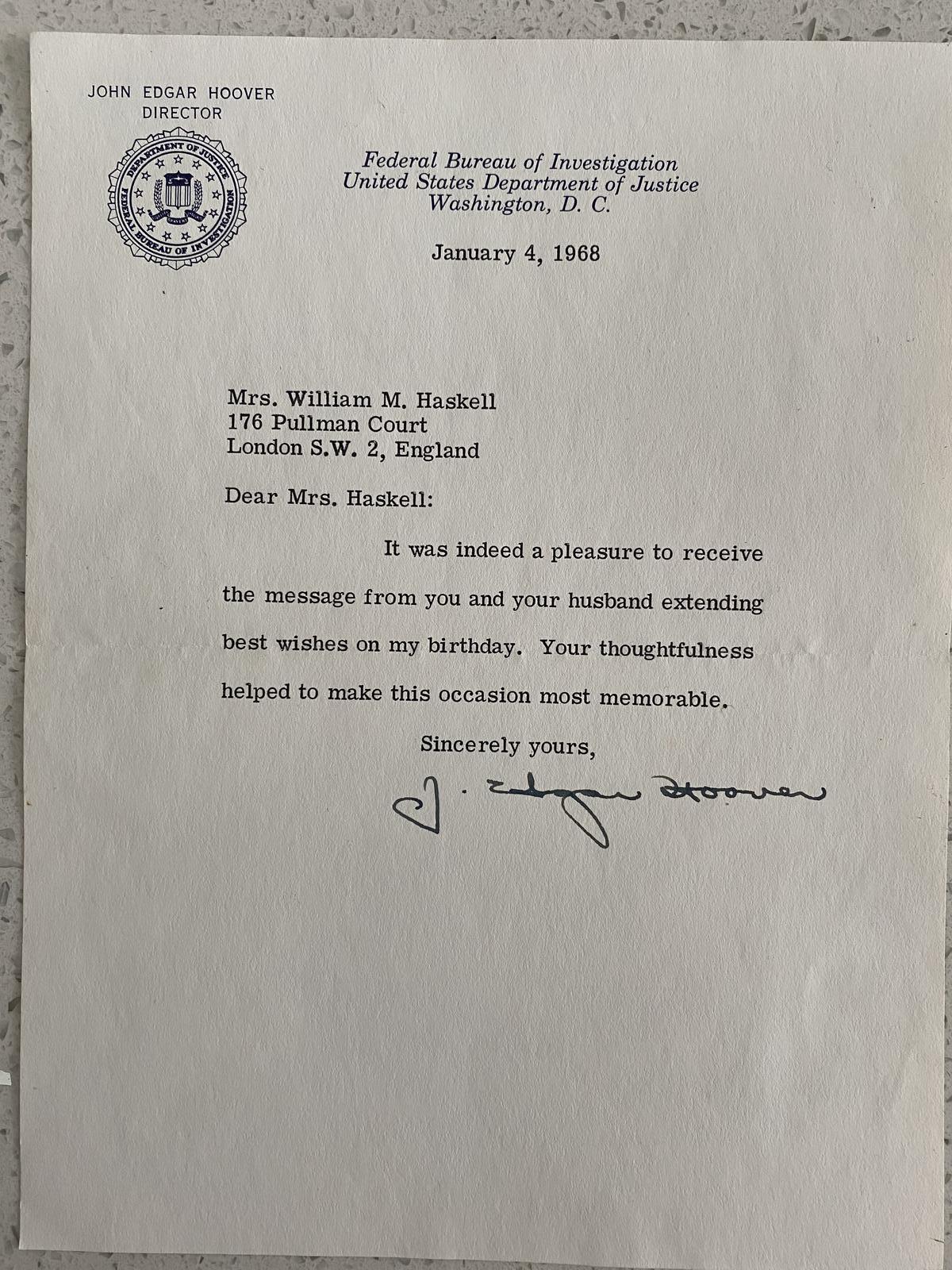 Original Signed Letter From J.Edgar Hoover