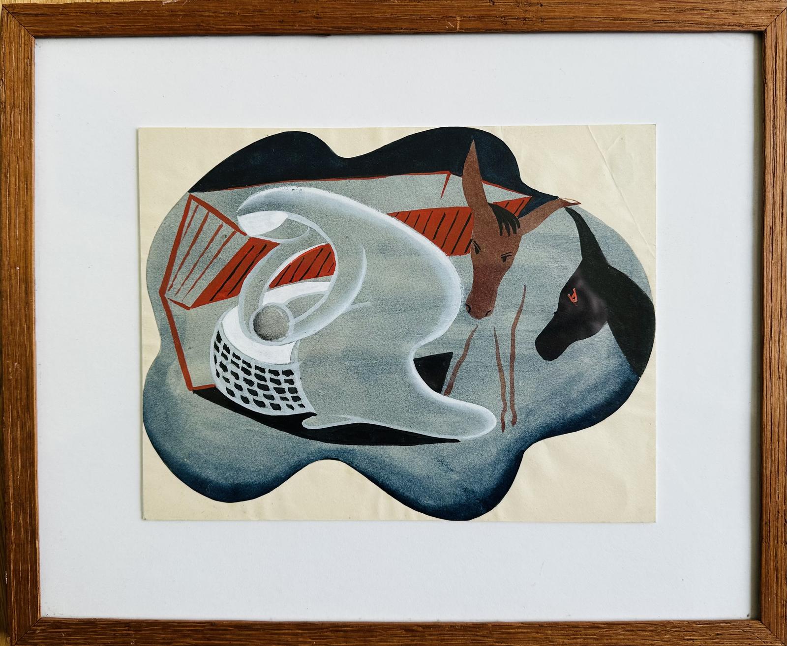 Original Surrealist Gouache on Paper 'Donkeys at the Manger' Attributed to George Elmslie Owen (1899-1964) Purchased from Elspeth Buchanan in Edinburgh (1915-2011) c.1990
