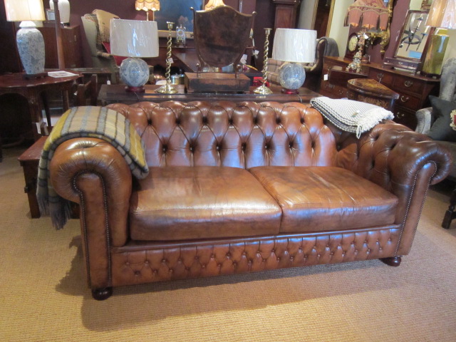 Original Tan Leather Buttoned Chesterfield Settee