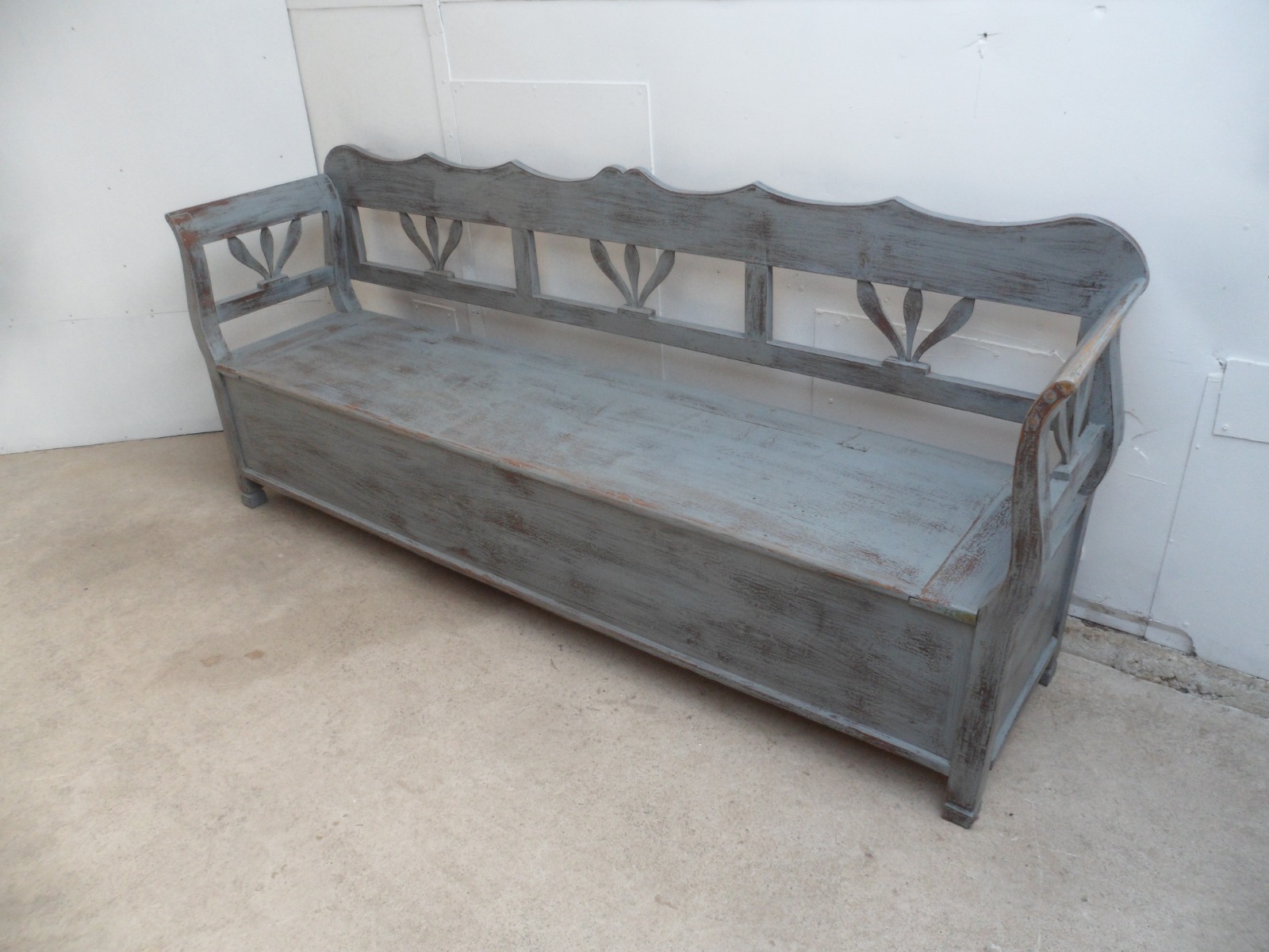 Original Victorian Grey & Red Antique Pine Hall / Kitchen Box / Settle / Bench