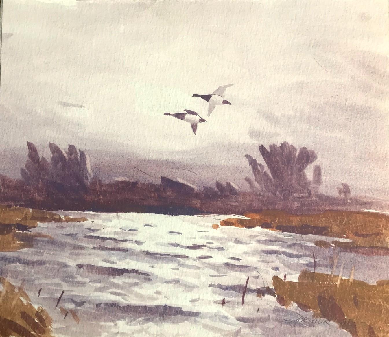 Original Watercolour 'geese in Flight' by Arthur Gee (1934-2011) Signed