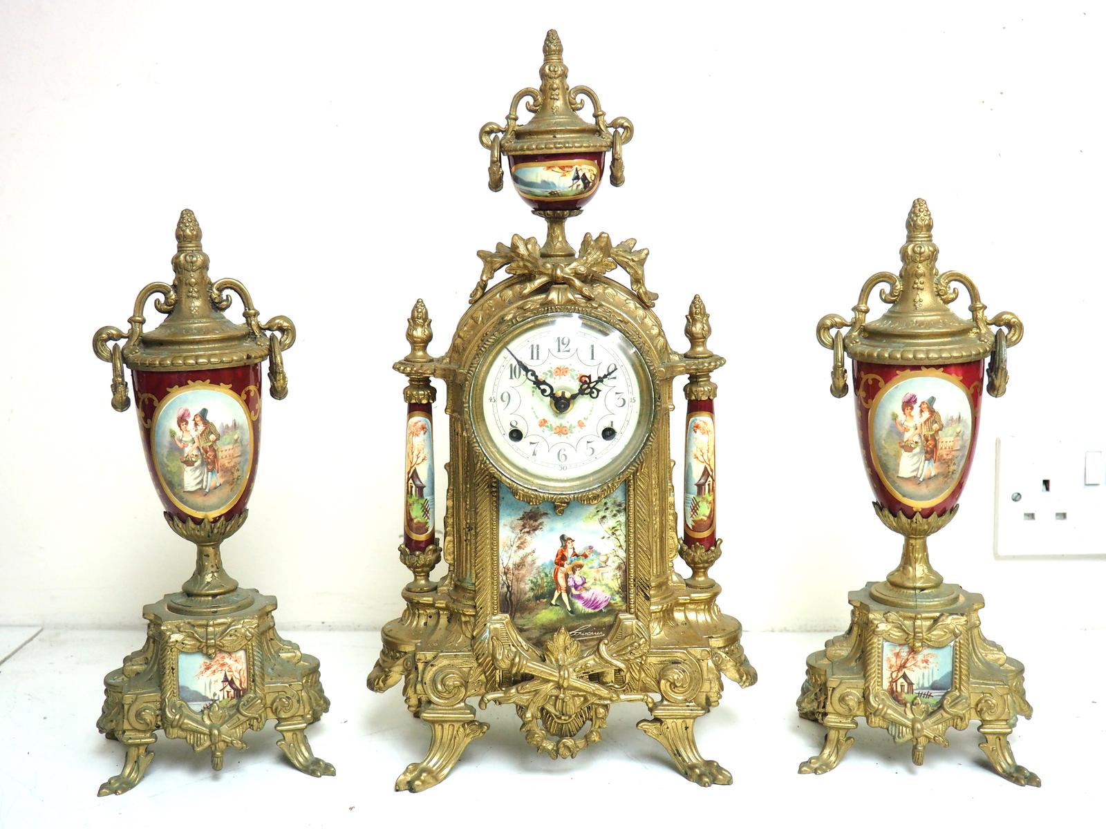 Ormolu Antique Victorian Style Mantel Clock Set - Sevres Style Panels & Ormolu Case by FHS (1 of 13)