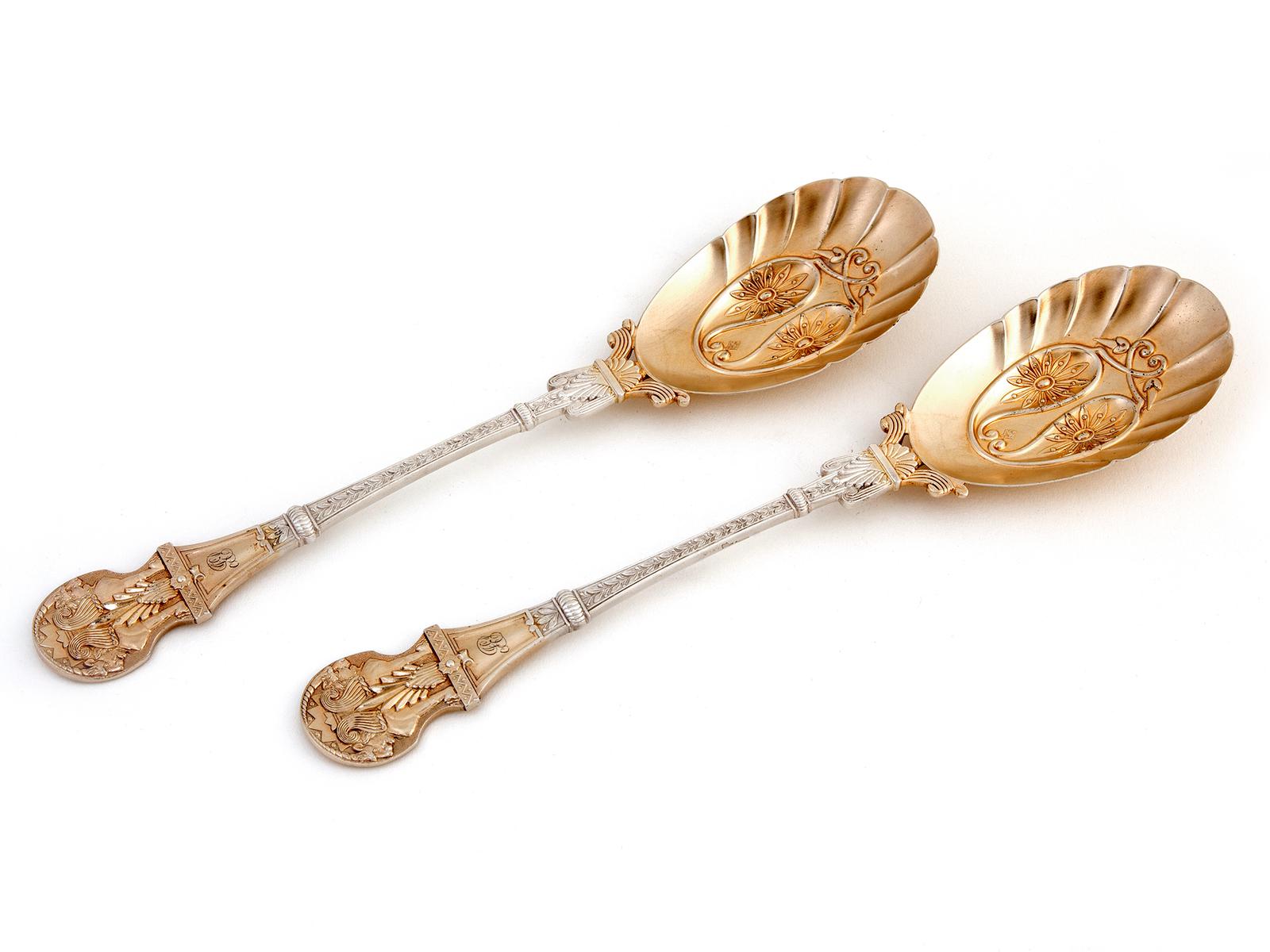 Ornate Boxed Pair of Victorian Silver Plated Partial Gilt Serving Spoons