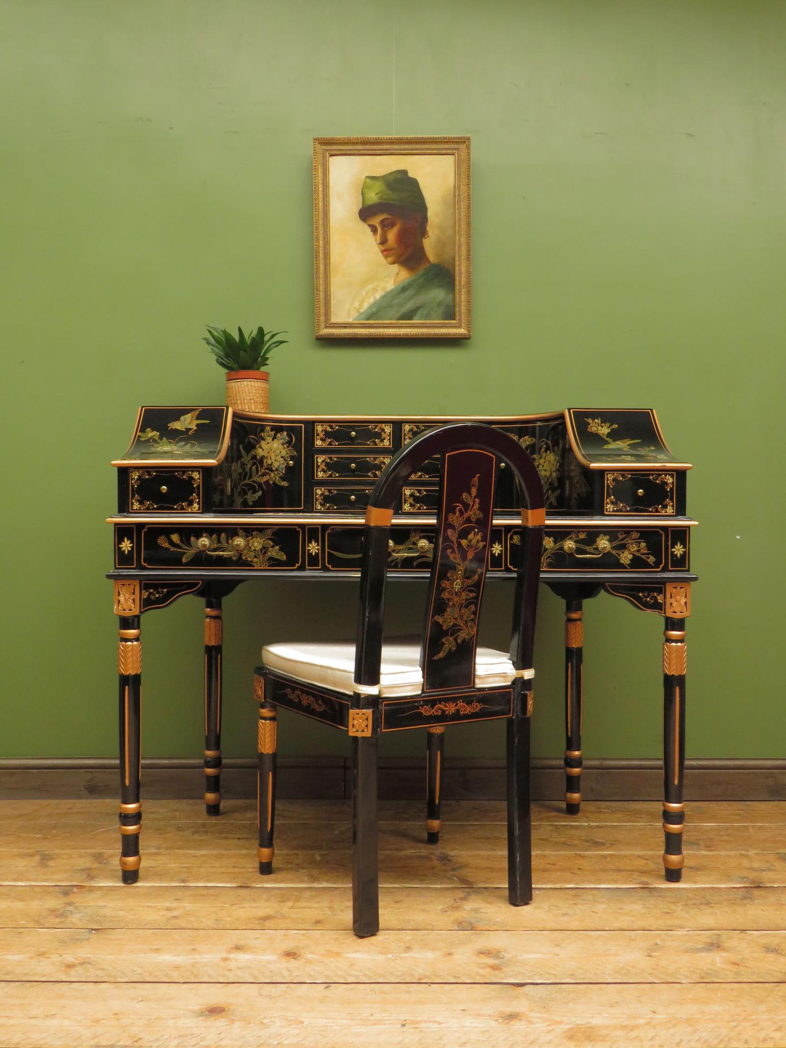 Ornate Chinese Black Lacquered Carlton House Desk & Chair