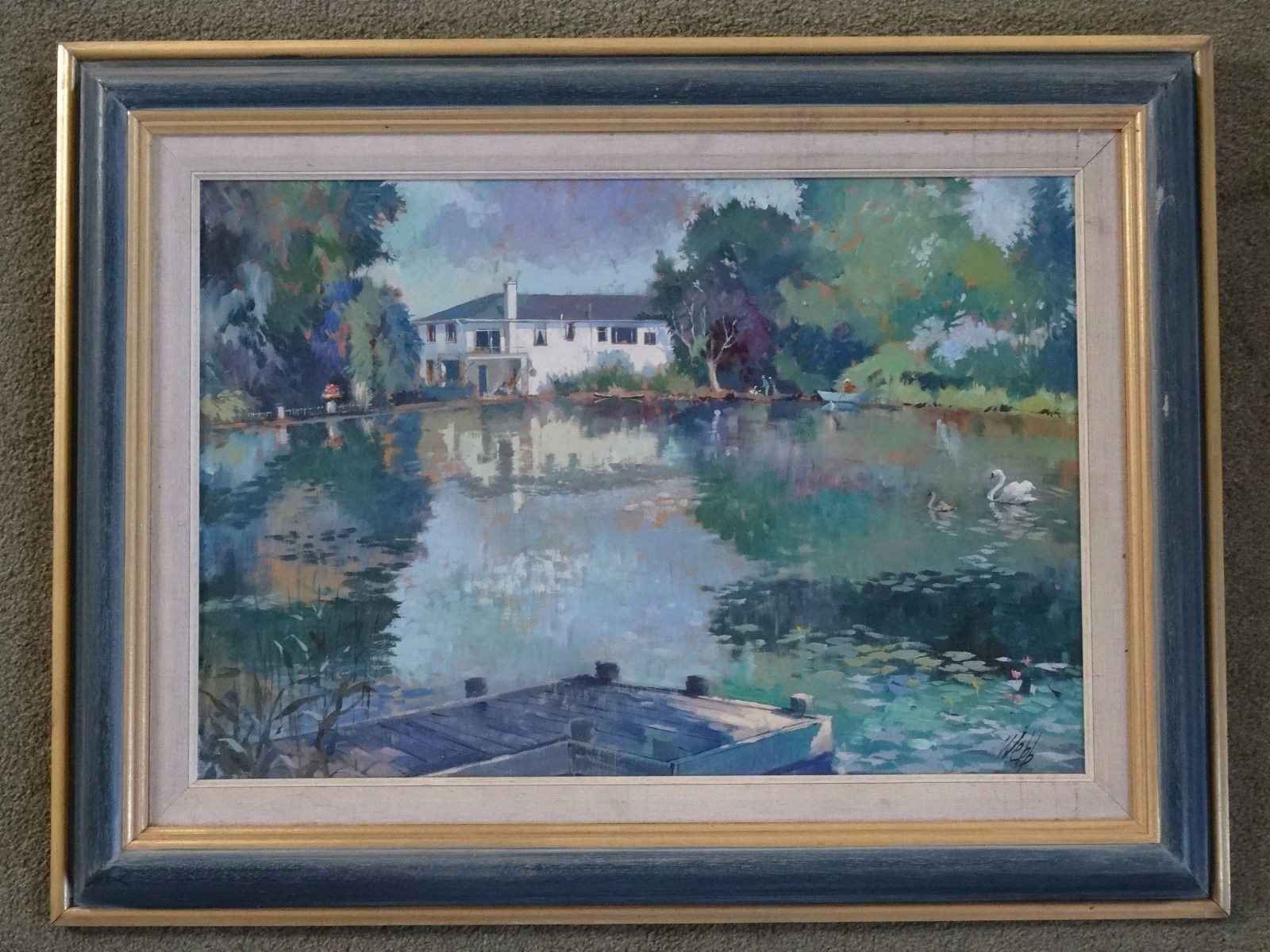 Osman P M Webb (1913-2003) Lovely Impressionist Oil Painting 'lake house' Arbsa