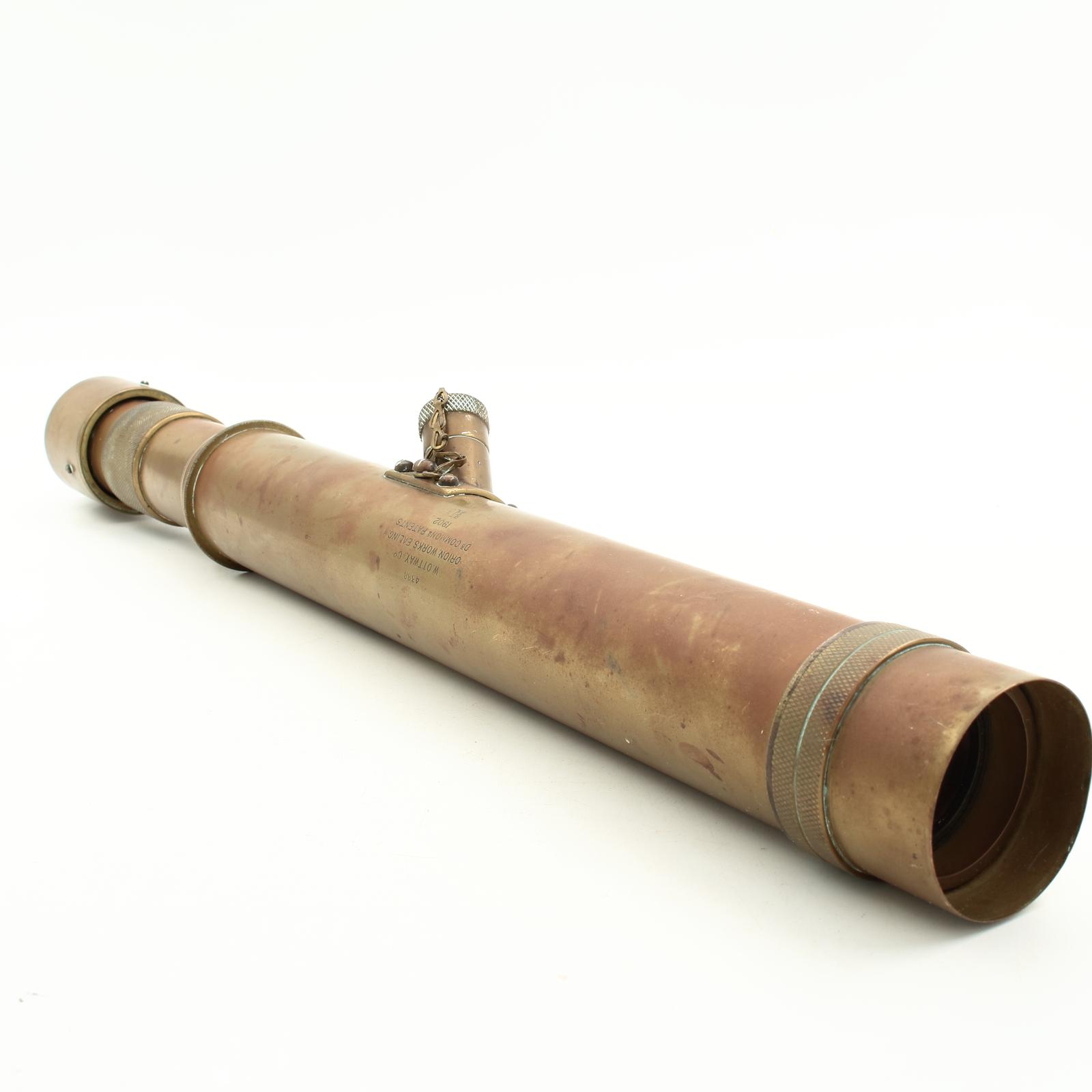 A fantastic Edwardian era telescope gunsight made by William Ottway in brass, very heavy, marked 4388, W. Ottway Co, Orion Works Ealing w, Dr Commons Patents, 1902, and a few other marks. I trust these type of telescope gunsights were used on the gun turrets of British Royal Navy ships.