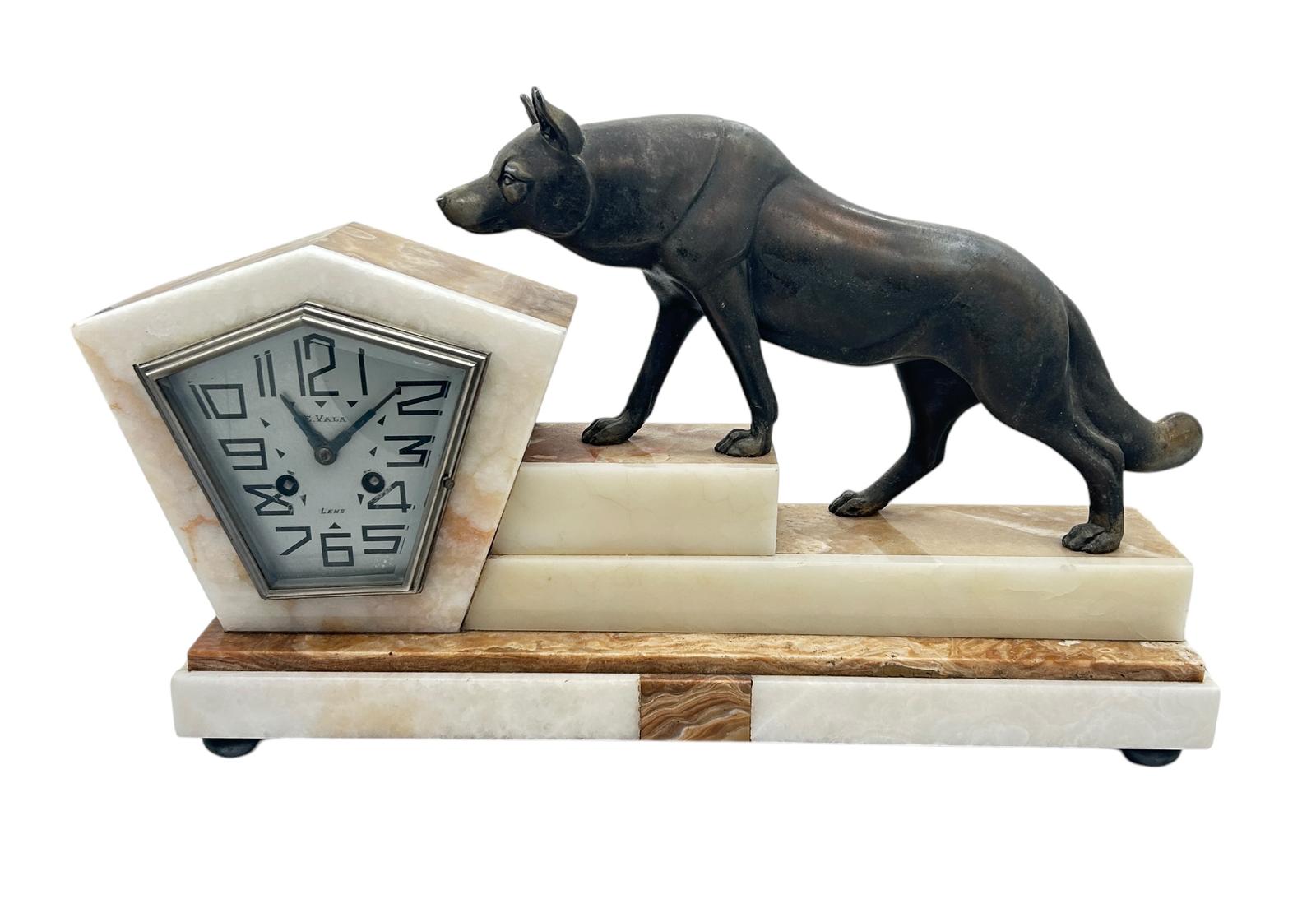 Outstanding French Art Deco Marble & Alsatian Dog Figural Mantel Clock ca.1920
