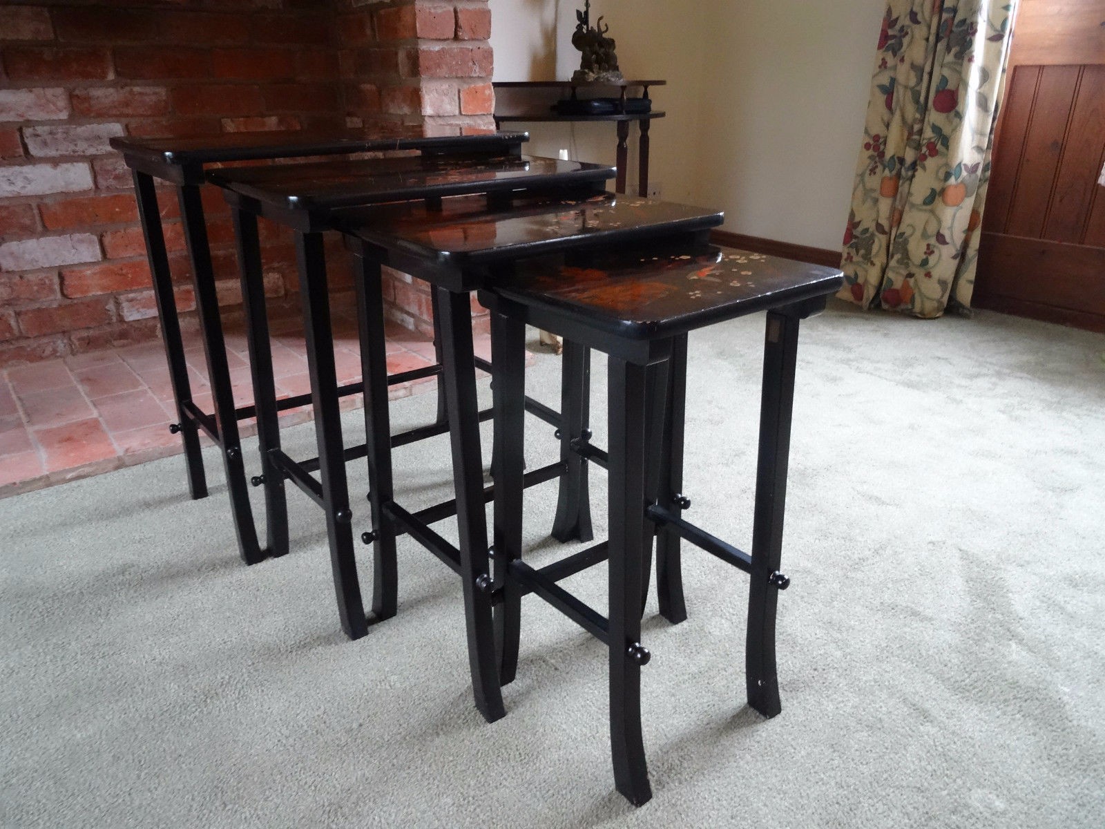 Outstanding Nest of 4 Oriental Lacquered Chinoiserie Tables with Birds
