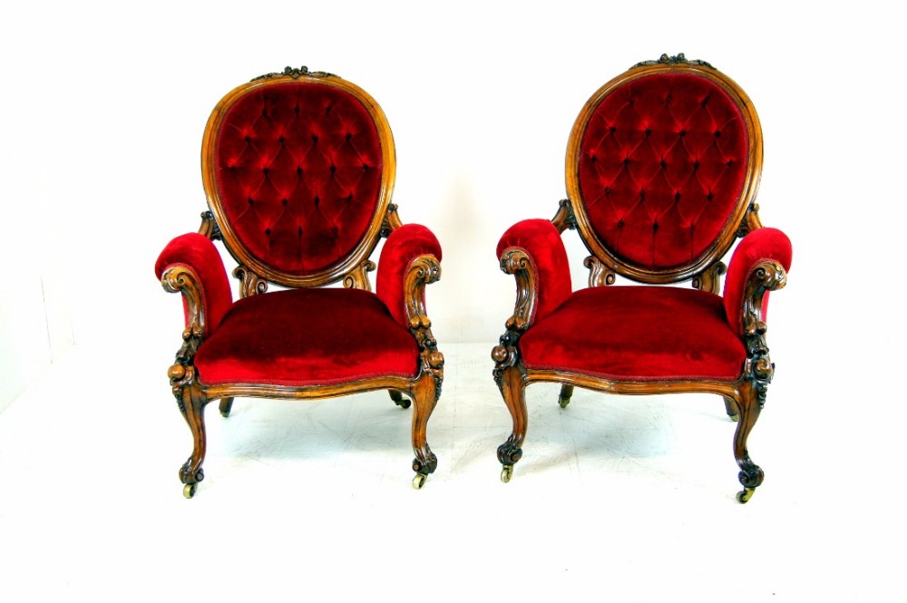 Outstanding Pair of Open Armed Victorian Walnut Gentleman's Chairs