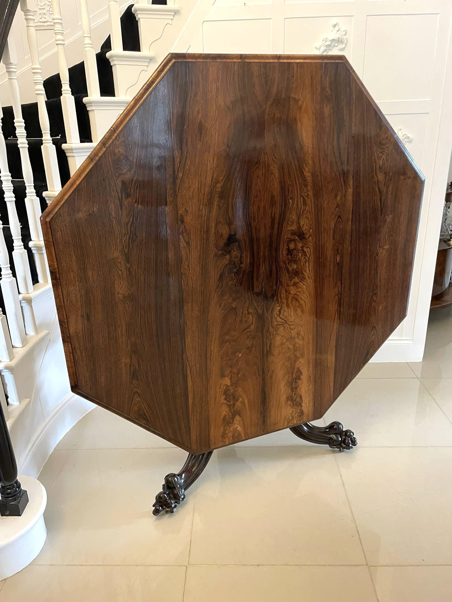 Outstanding quality large antique early Victorian rosewood centre/dining table by Gillows having a large remarkable quality hexagonal rosewood top with a thumb moulded edge and rosewood frieze supported by turned carved solid rosewood pedestal column standing on three carved solid cabriole legs with magnificent quality carved feet on original castors.