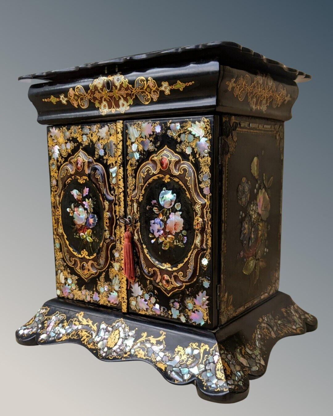 Outstanding Victorian Papier Mache Jewellery Cabinet / Sewing & Writing
