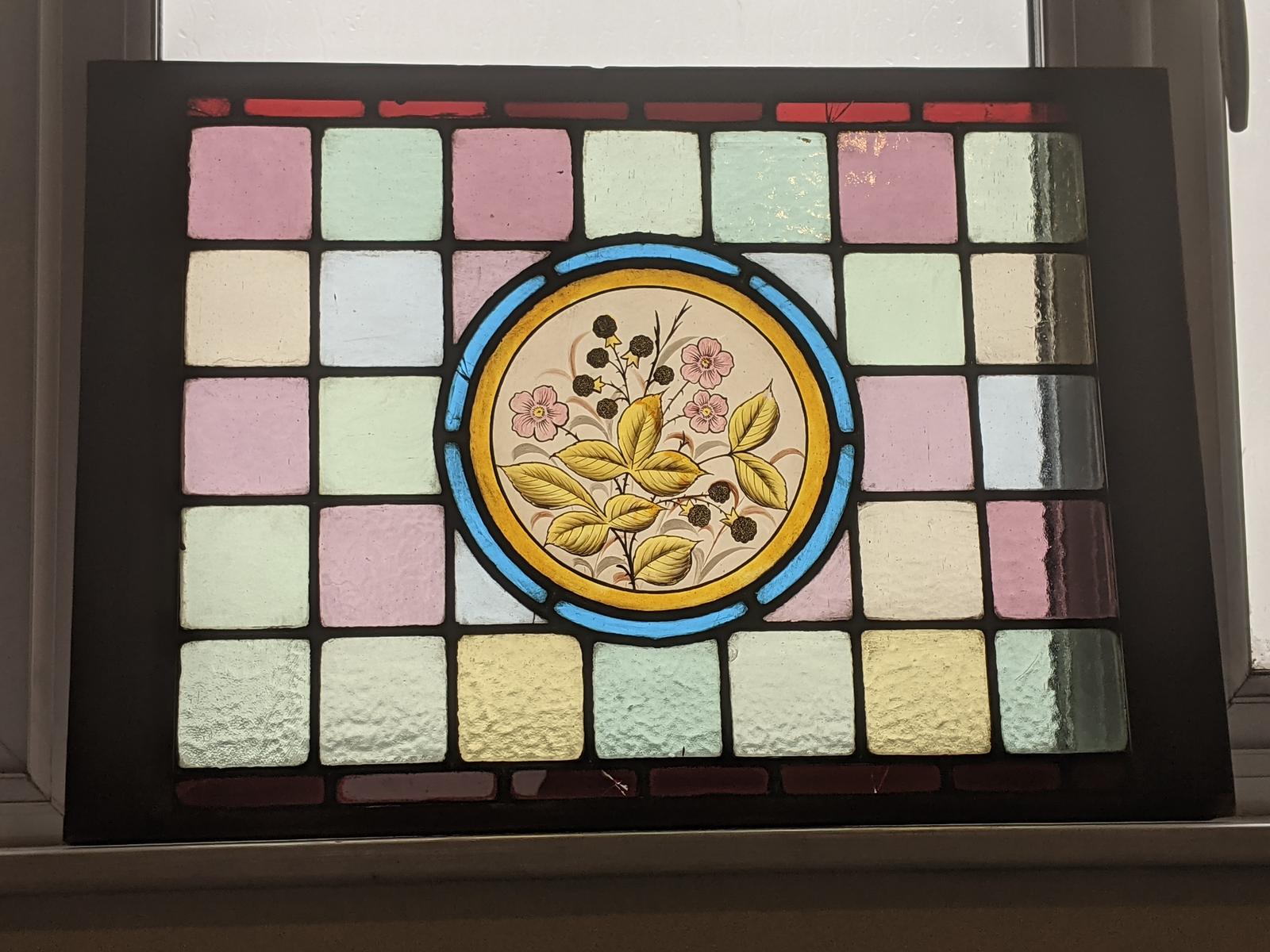 Outstanding Victorian Stained Glass Panel with Beautiful Central Hand Painted Element of Blackberry Plant