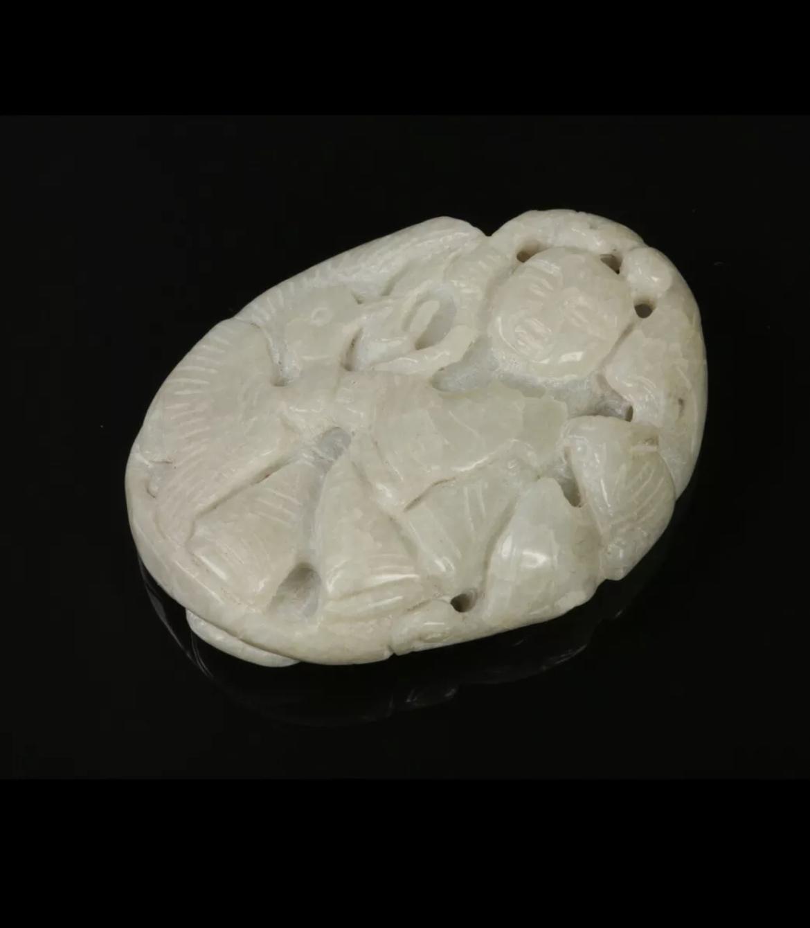 Oval Chinese Carved Nephrite Jade Amulet Coin with a Phoenix, Bat & Carp