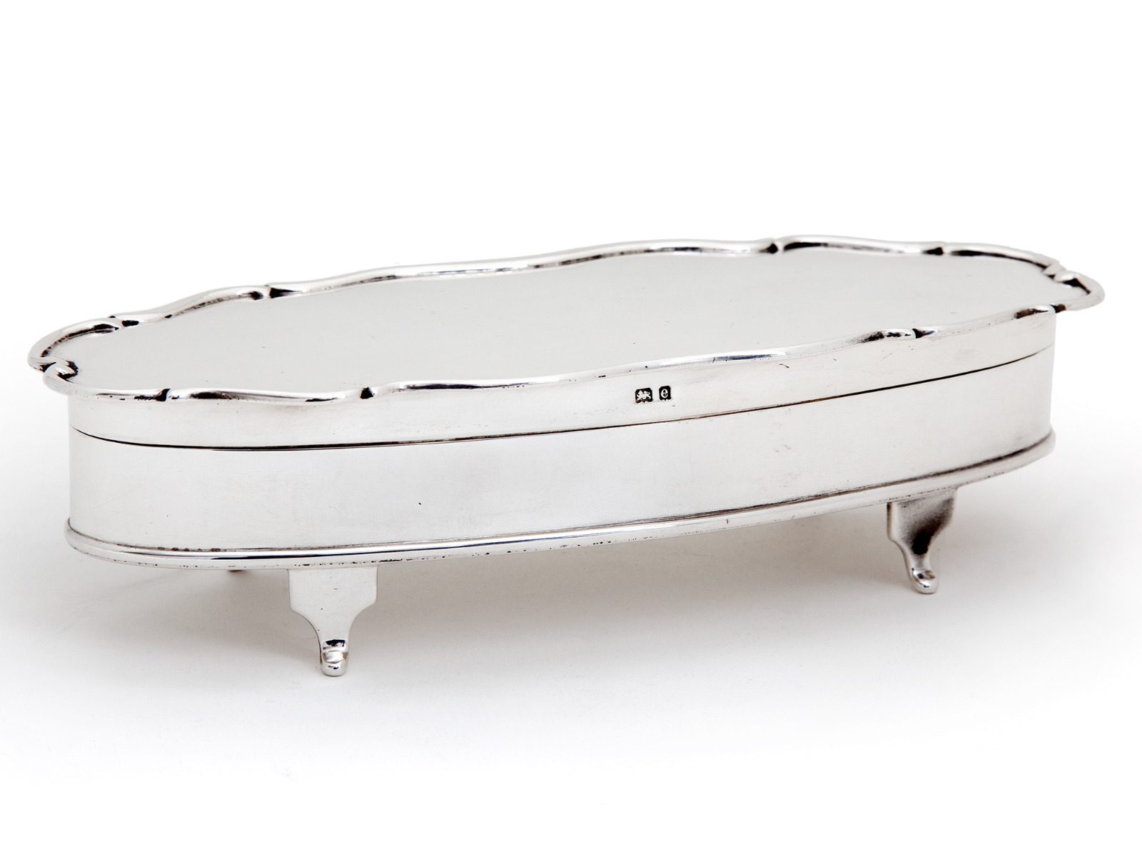 Oval Edwardian Silver Jewellery Box with a Gilt Interior & Scroll Border Hinged Lid (1 of 1)