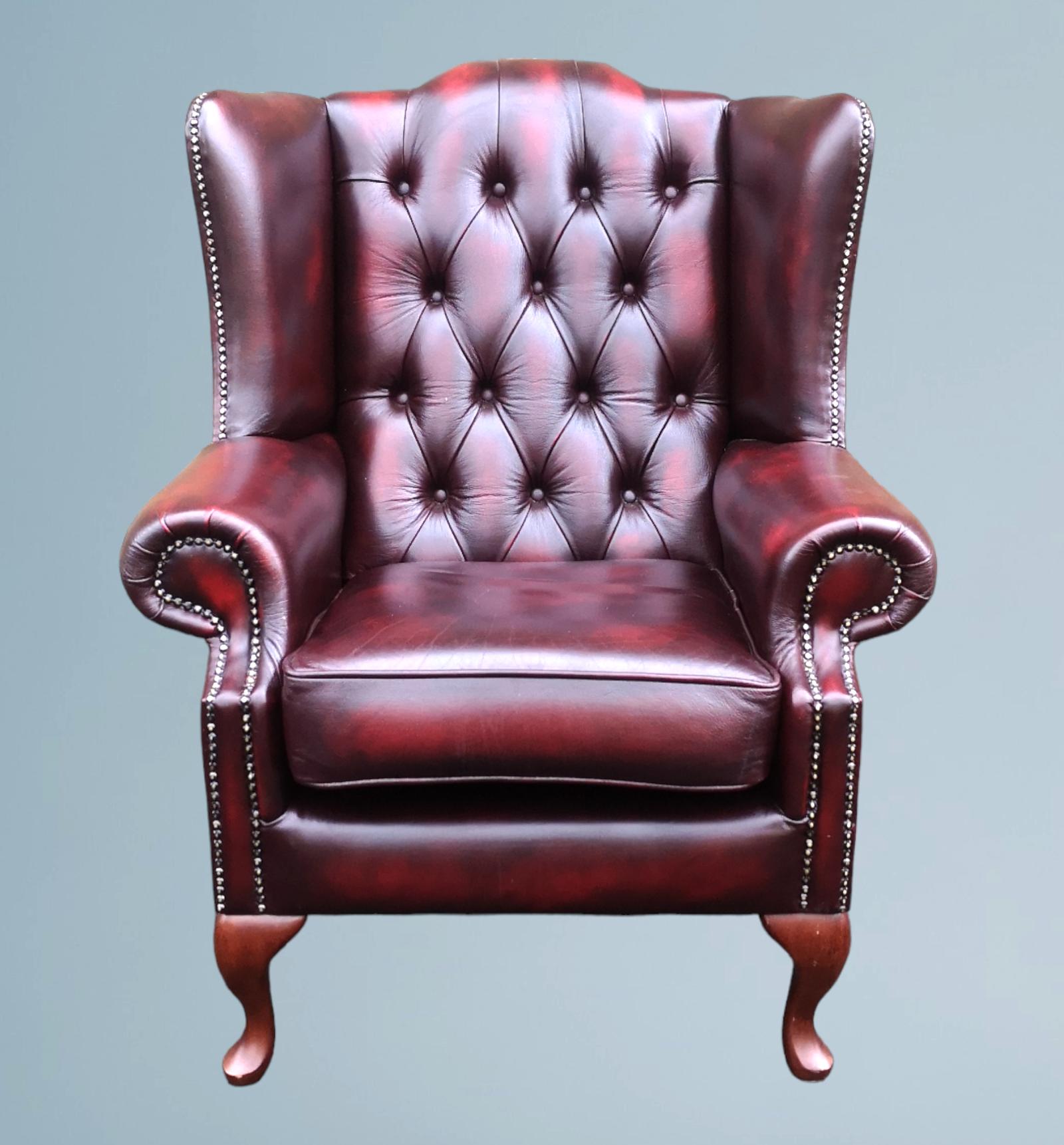 Oxblood Leather Queen Anne Wing Back Chesterfield Armchair