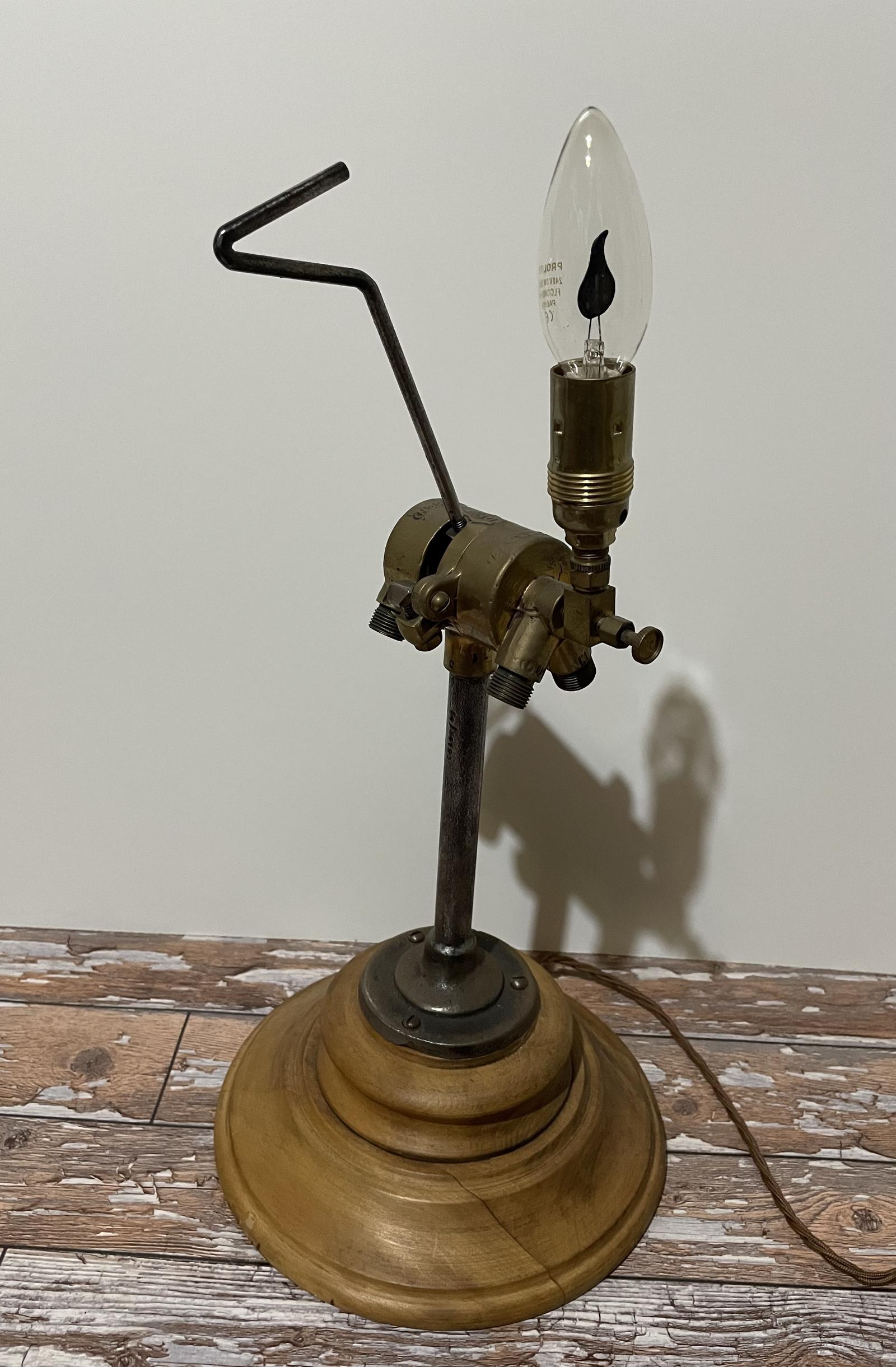 A Table lamp fashioned from a 1960's Oxy-acetelyne "Equaliser valve" mounted on a wooden base. Fitted with a "flicker" bulb to give a flame effect.