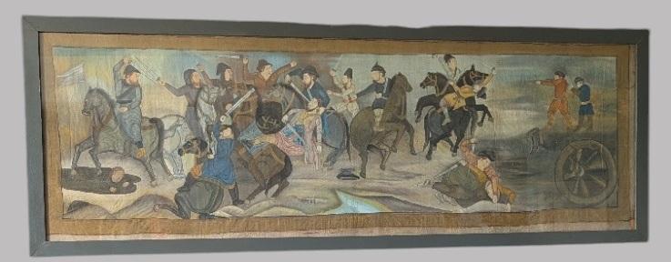 Painting on silk depicting a battle of possibly Persian or Turkic in Central Asia. Paintings on silk of battles were often reproduced in Countries like Uzbekistan, Iran or Western China. The painting is presented in a later wooden frame.