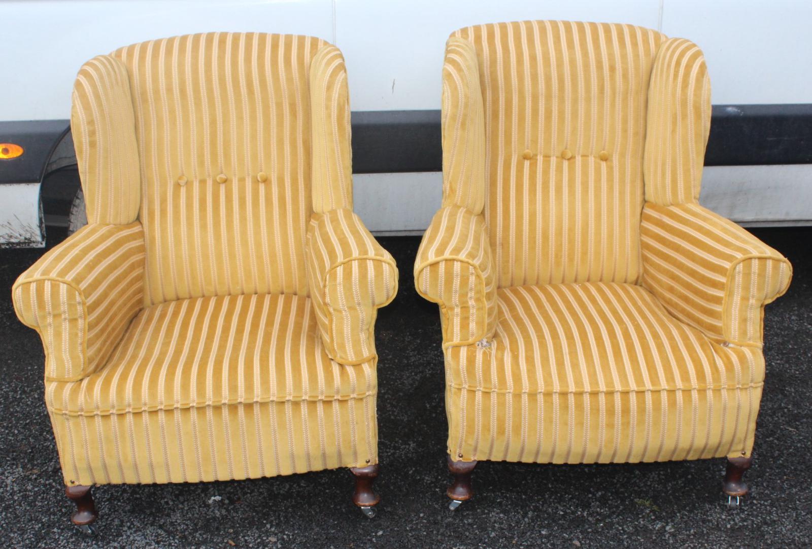 Pair 1940s Mahogany Wingback Armchairs Upholstered in Gold