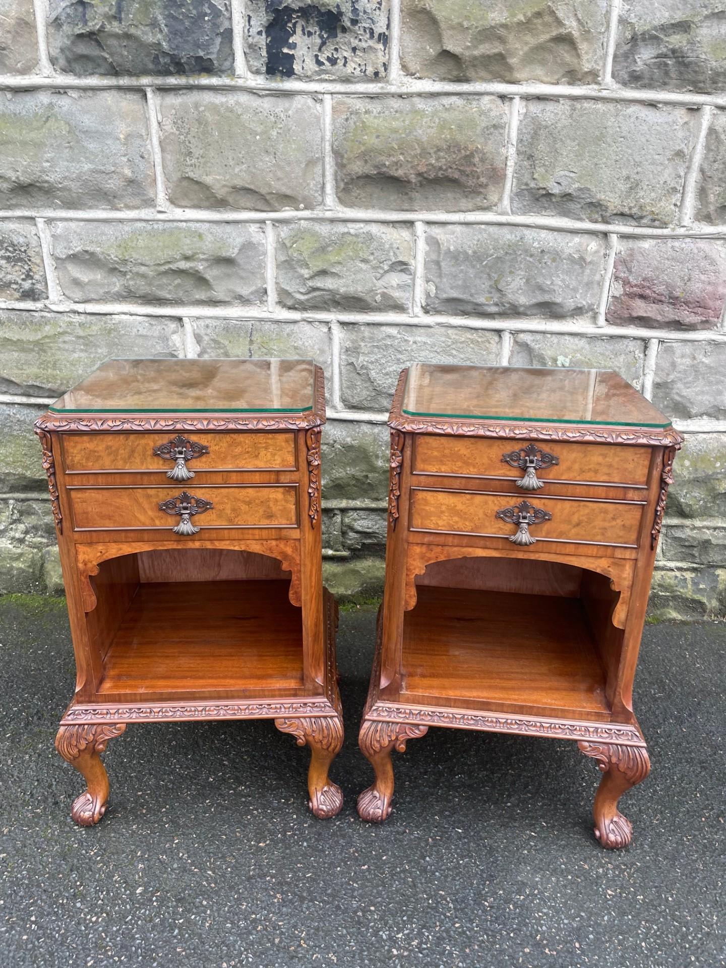 In burr walnut, protective glass tops, 2 draws with open storage area below, polished walnut sides standing on well carved small cabriole feet