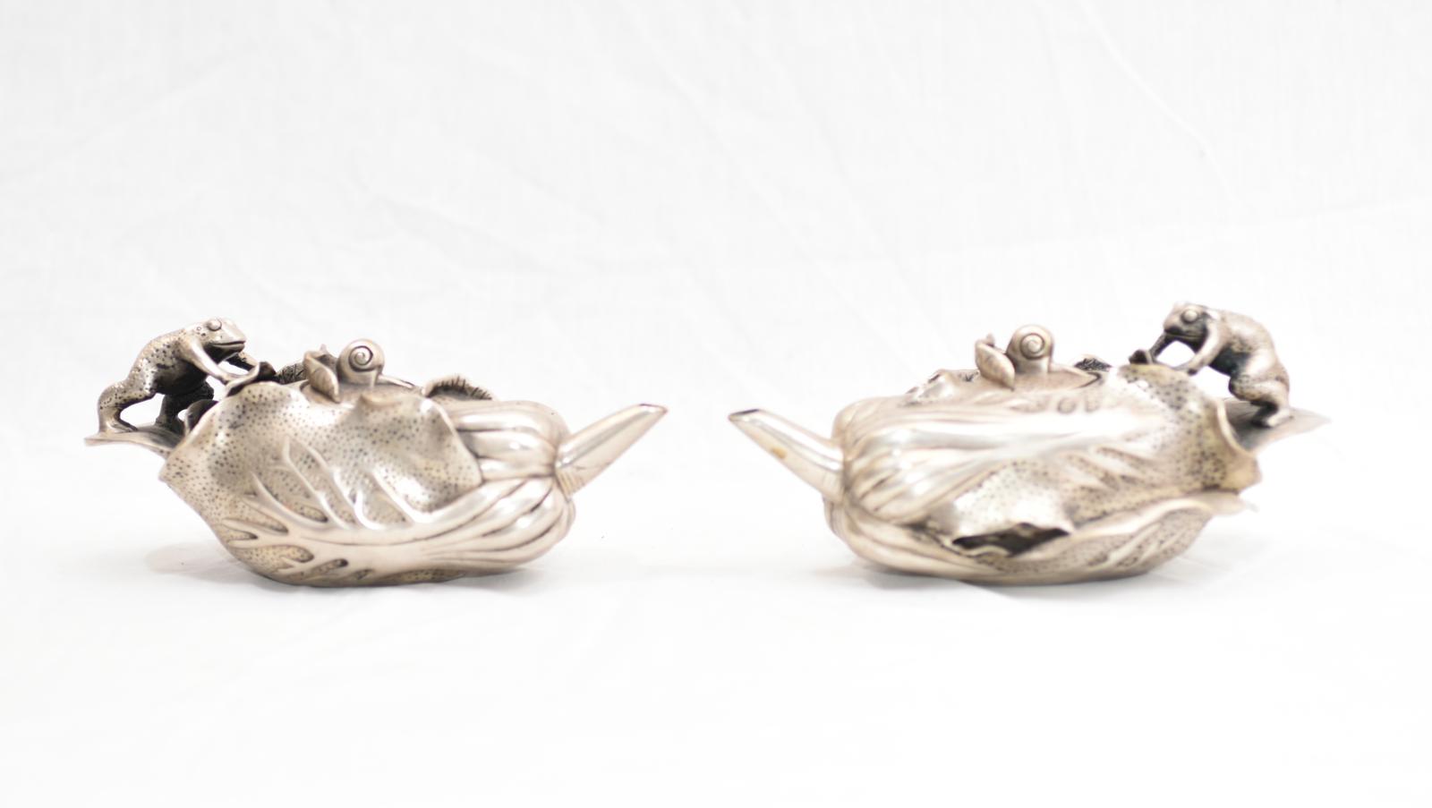 Pair Antique Chinese Tea Pots 1930 Cantonese Pewter