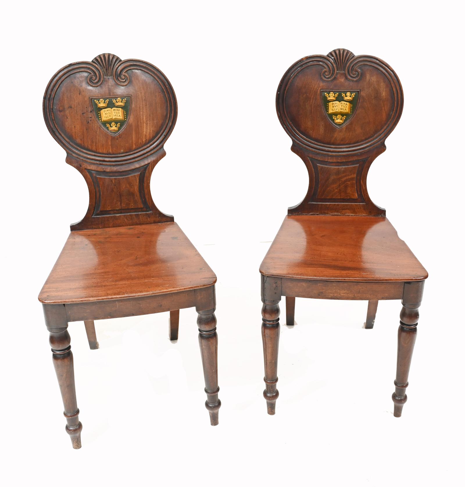 Pair Antique Hall Chairs Mahogany Stately Home Crest