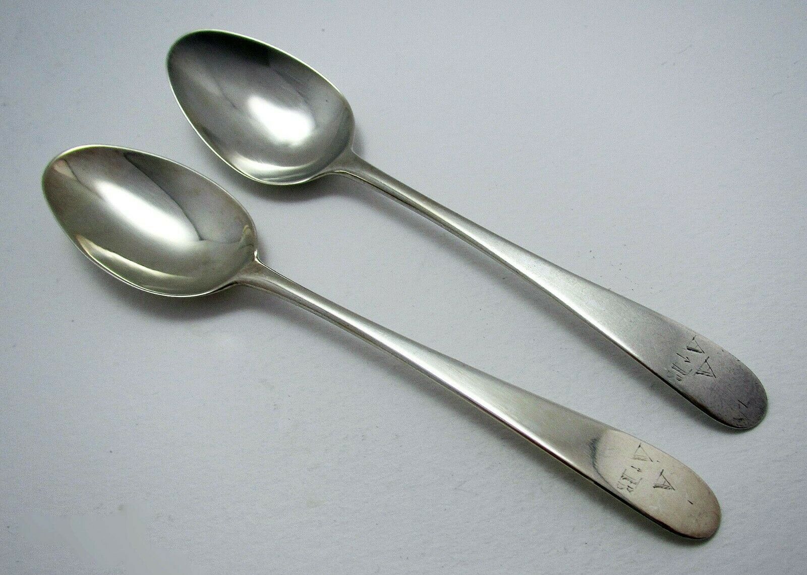 Pair Antique Hester Bateman (C1785) Georgian George III Solid Sterling Silver Tea Spoon Teaspoons.