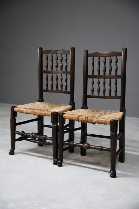 Pair Antique Oak & Rush Lancashire Chairs