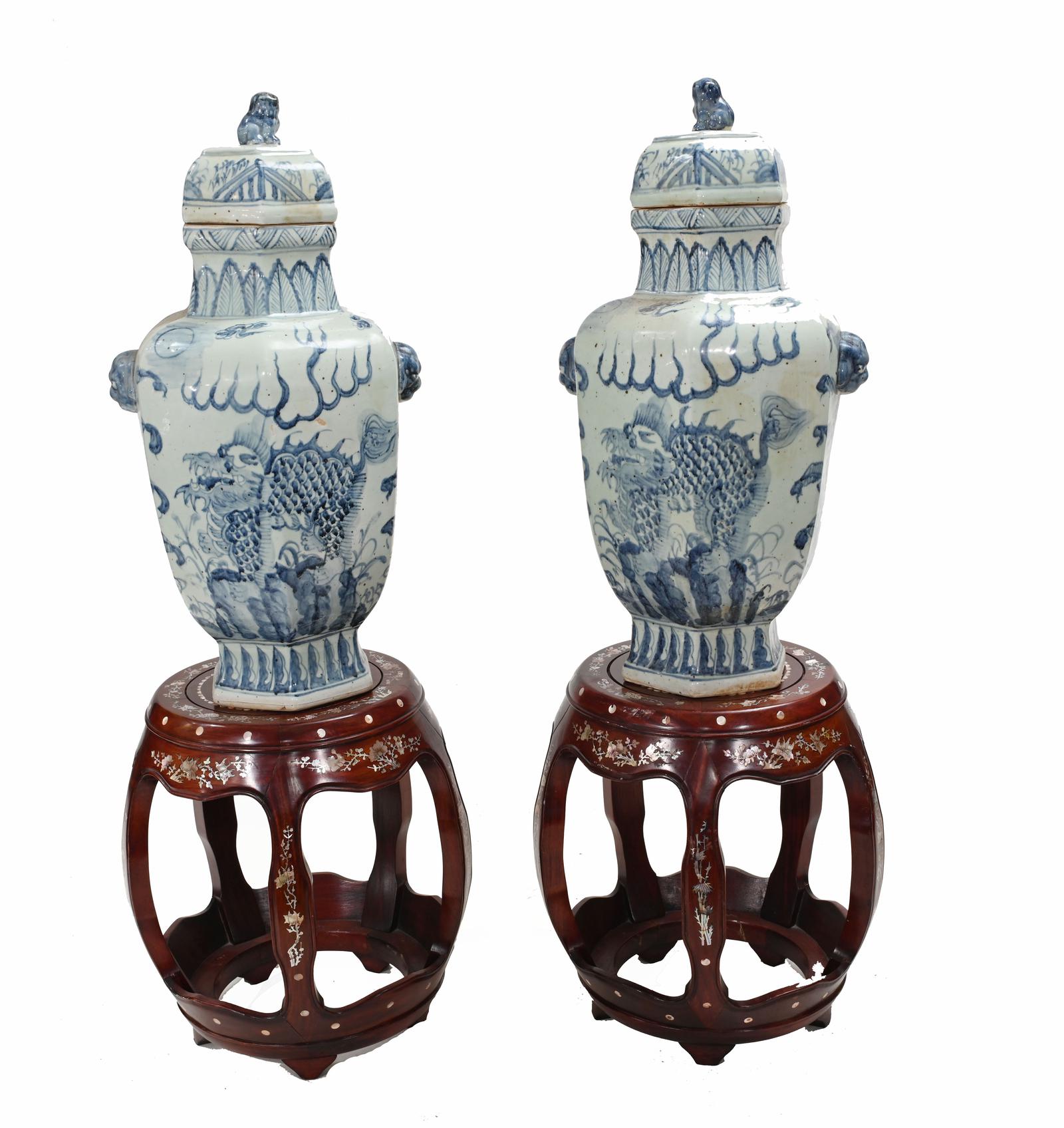 Pair Chinese Barrel Seats Pedestal Stand Tables