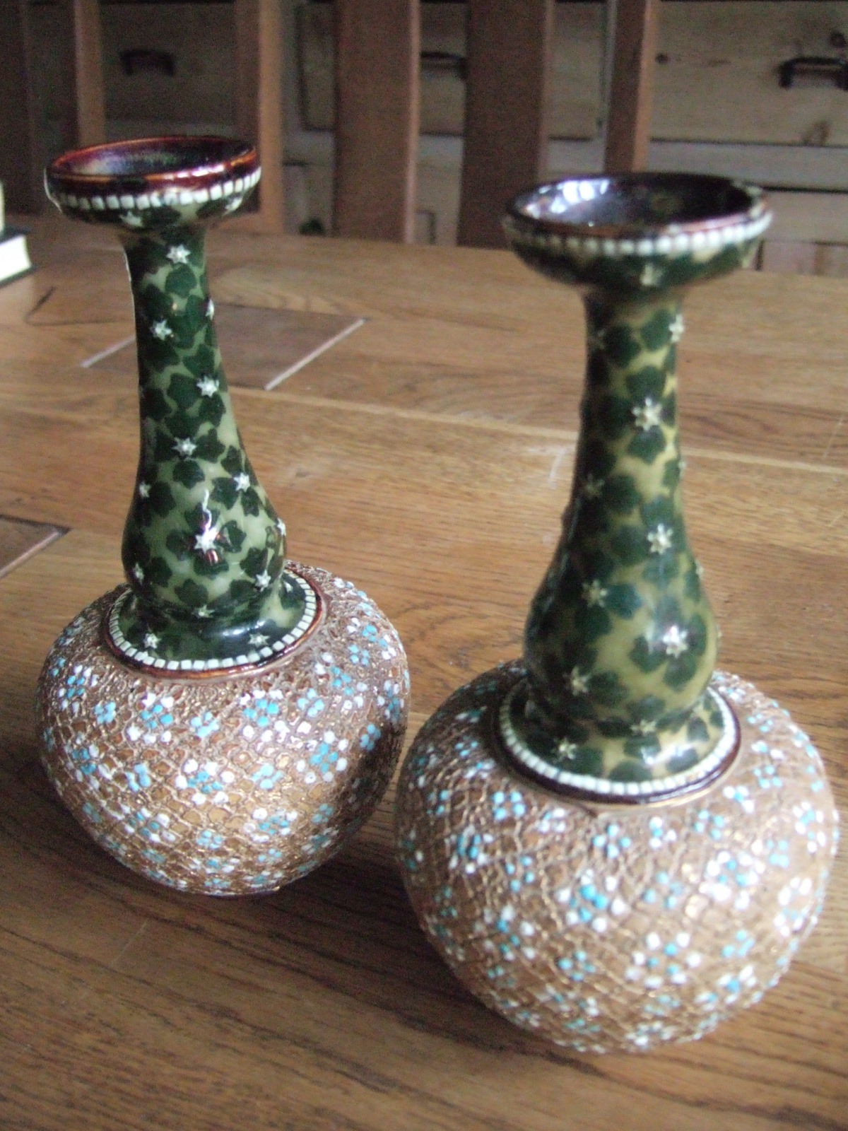 Pair Doulton Lambeth Lace Effect Vases Ca. 1900