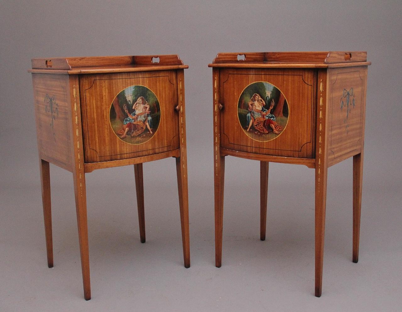 A highly decorative pair of early 20th Century satinwood and hand painted bedside cabinets in the Sheraton style, the tops having hand painted floral decoration and a three quarter gallery with fret carrying handles either side, a tambour front door below opening to reveal a large compartment space, the door fronts having a circular hand painted panel depicting a countryside scene of a man and woman holding each other, the sides of each cabinet have hand painted floral decoration and ribbons, supported on elegant square tapering legs. Circa 1920.