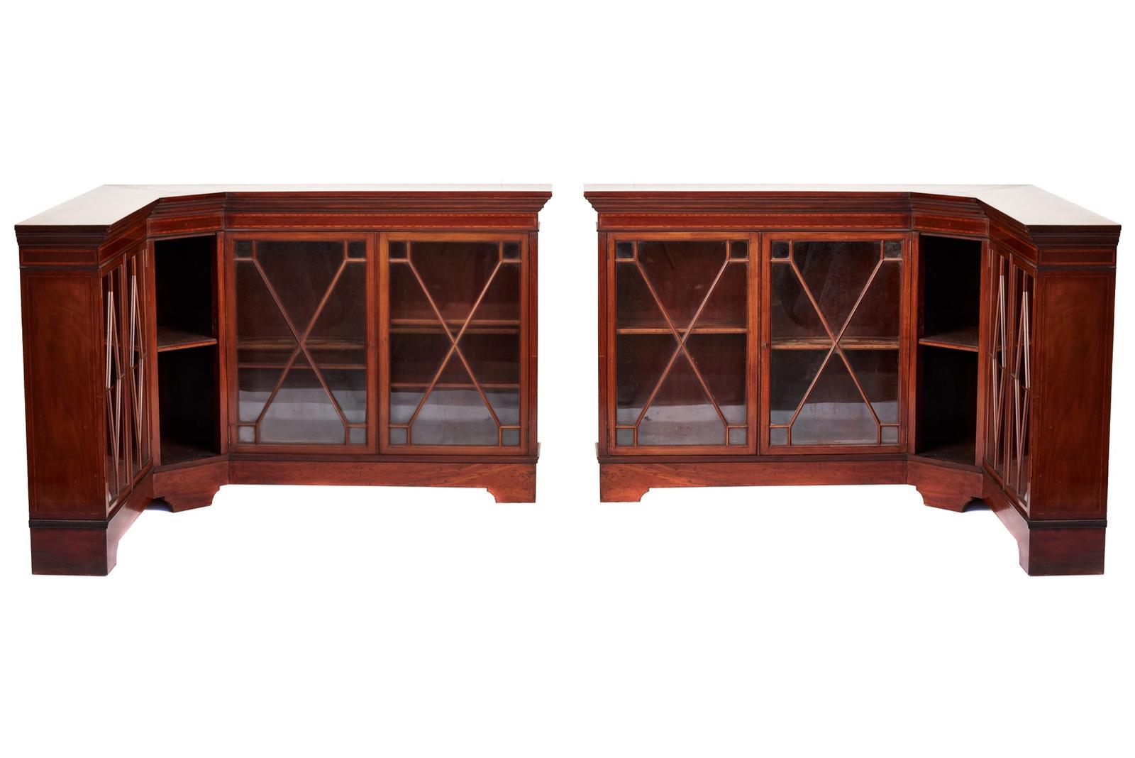 Pair Edwardian Inlaid Mahogany L Shaped Corner Cabinets