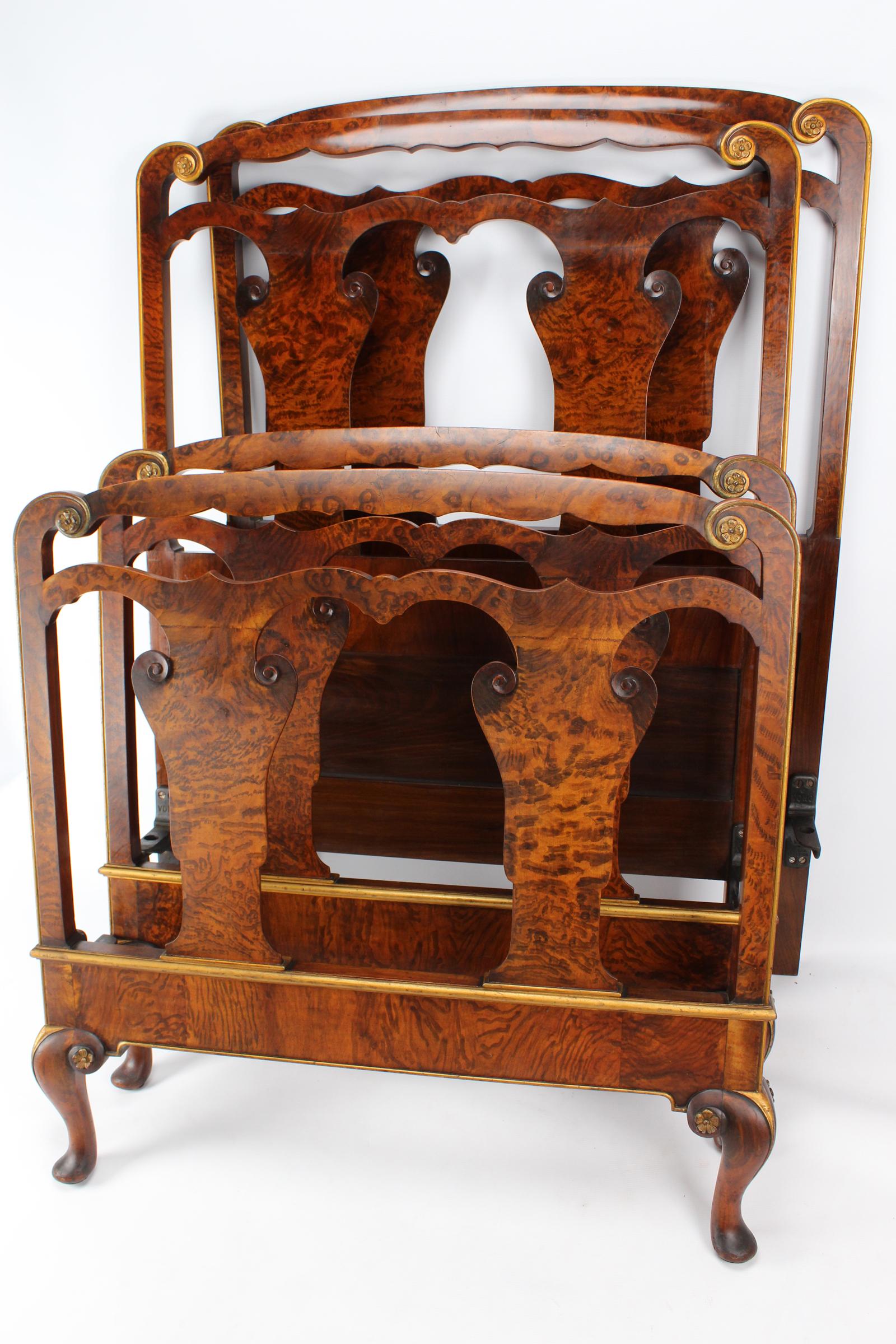 A magnificent pair of antique single walnut beds in Queen Anne revival style dating from circa 1910. The headboards and footboards have arched top rails with carved and gilt roundels over twin splats and stand on small carved cabriole legs. In walnut with a scumbled burr finish and gilt highlights. The headboards and footboards come complete with four iron screw-in side rails and take standard single mattresses; the “Vono” frames are easily assembled or dis-assembled for transport. Comprises two headboards, two footboards and four side irons (no base, mattress or bedding included). Comes with Vono spanner for assembly.