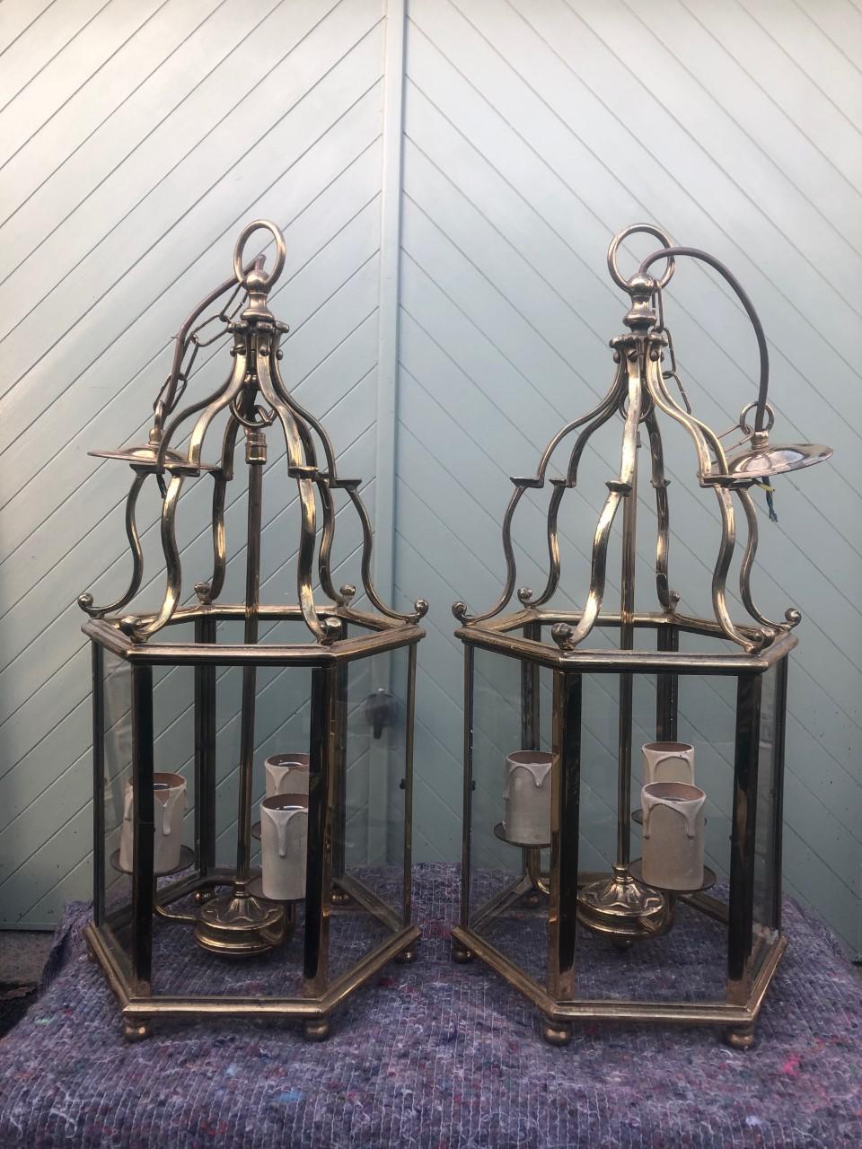 Pair English Glazed Brass Lanterns