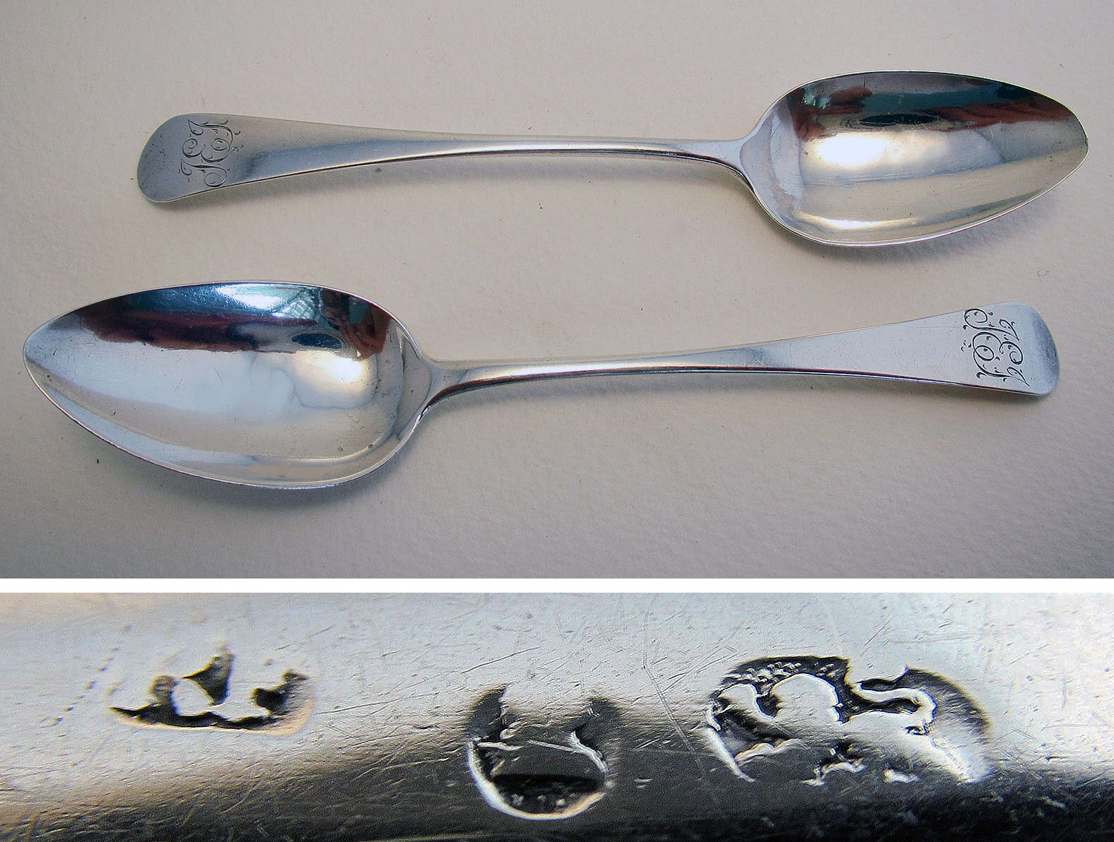 Pair English Provincial George III Solid Sterling Silver Tea Spoons by Richard Ferris, West Country Exeter C.1790