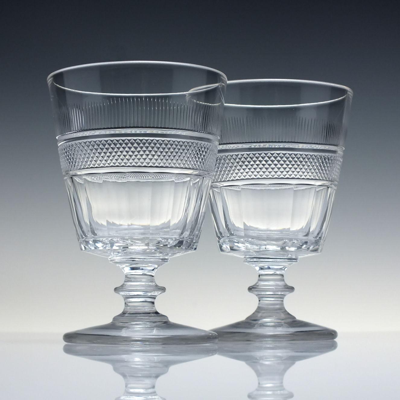 A superb pair of antique Georgian Anglo Irish glass rummers dating to c1820. They have large, tapered bucket bowls with a band of fine flute cuts above fine diamonds and slab flutes, seperated by prisms. Angular knop stems, conical feet and polished pontils.