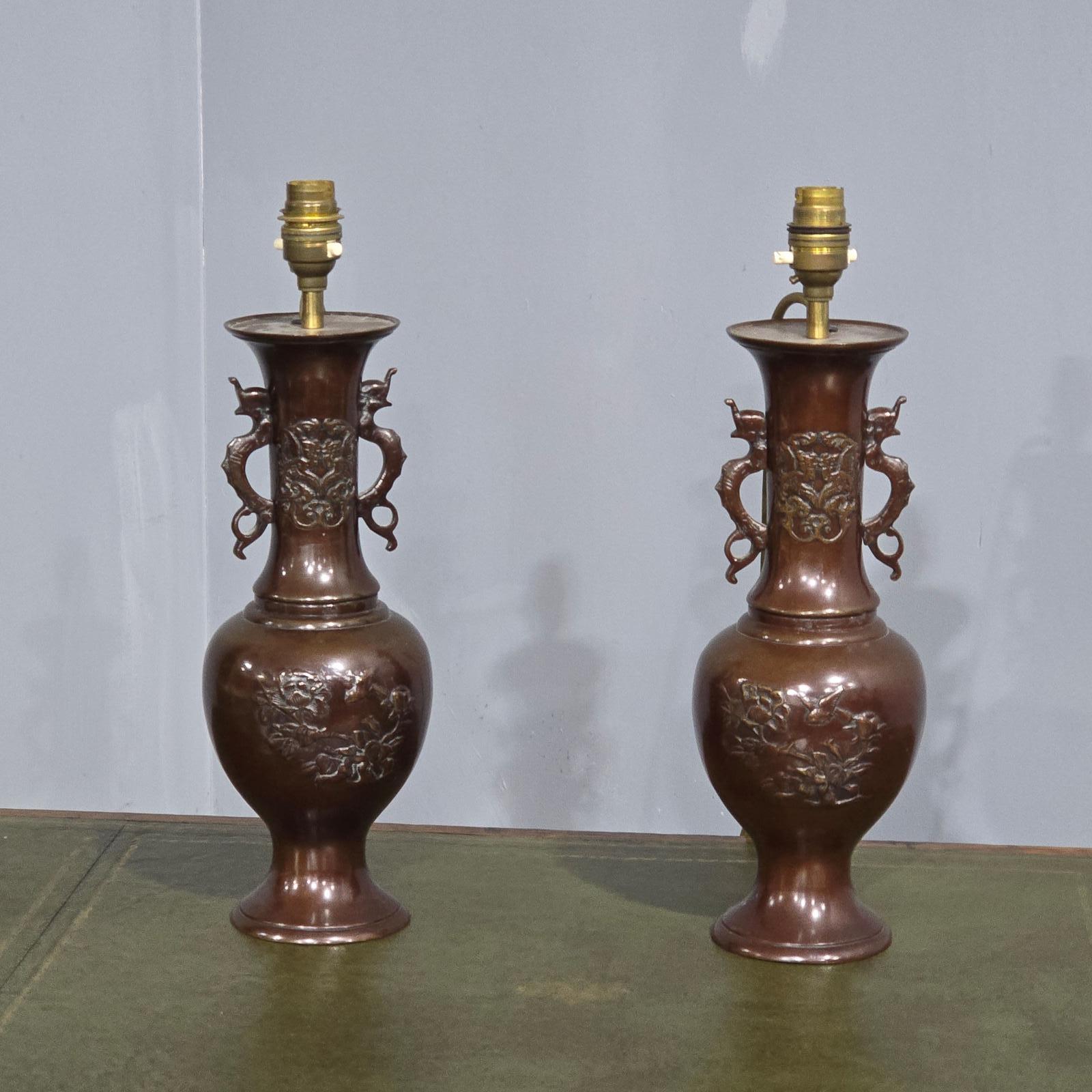 A very good pair of Japanese bronze table lamps with dragon handles, blossom relief to the fronts, in very good condition, rewired and ready for use.