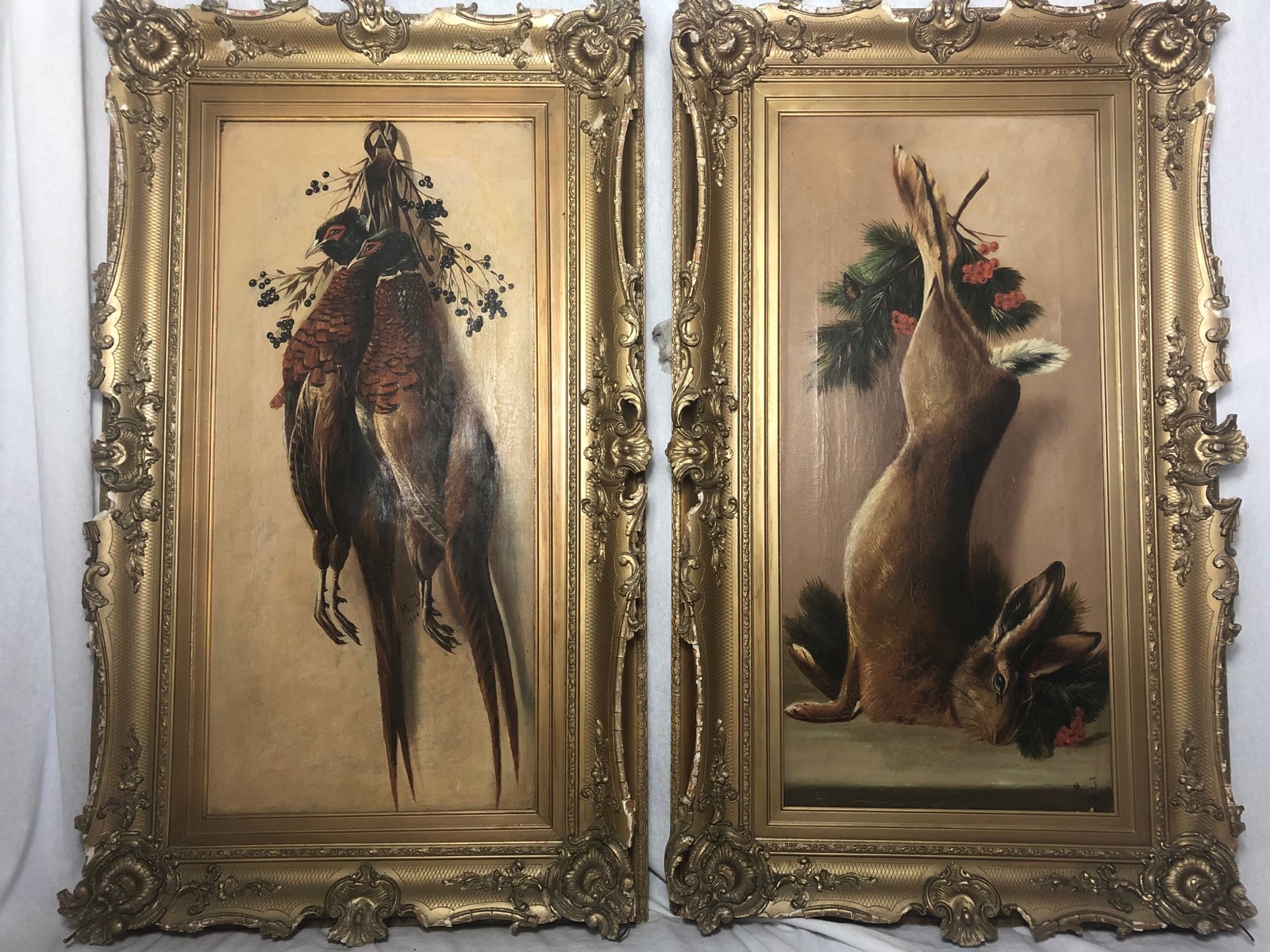Pair Large British School Antique Art Oil Paintings Artwork Study of Still Life Dead Hunt Game Pheasant Birds & RAbbit by Maud Thomas