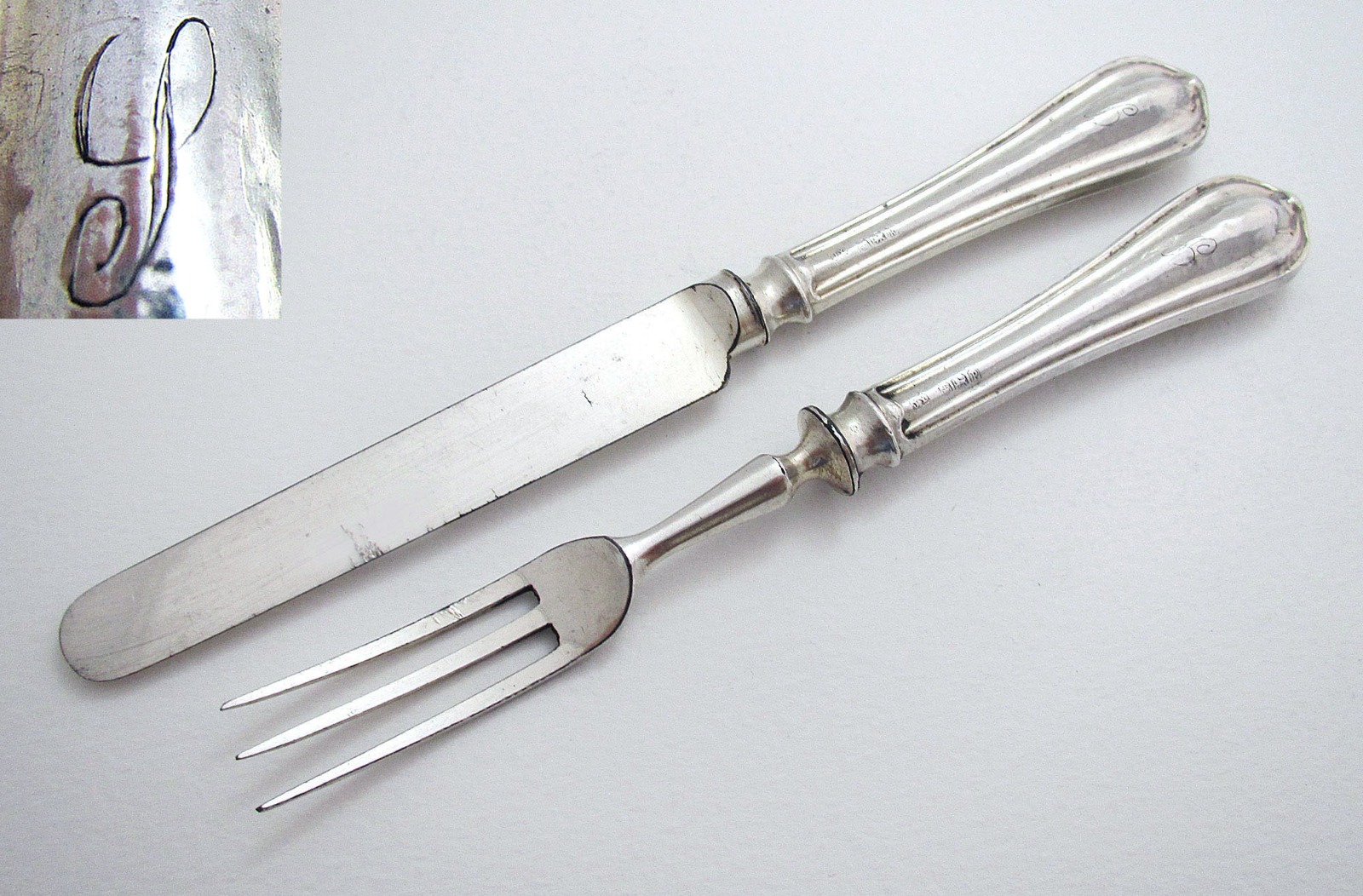Pair Monogram 'S', Sheffield Vintage Art Deco Sterling Silver Handled Tea Knife & Fork