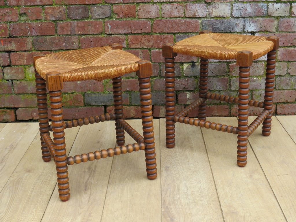 Pair Oak & Rush Seated Bobbin Stools c.1920