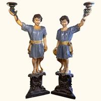 Pair of important carved figures of Page Boys that came from the chapel of a Monastery in the city of Pistoia, Tuscany, Northern Italy. The rare figures are of carved wood with the boys' tunics shaped in 'Cartapesta' , a late mediaeval Italian tradition similar to 'Papier Maché'. The original bottom plinths have been more recently mounted on later wooden triangular bases for increased balance. The 'Torchere' figures with their outstretched arms holding torches are 57 inches (145cm) tall. overall. The figures date from the end of the 17th Century although the original paint and gilding will be beneath later layers.