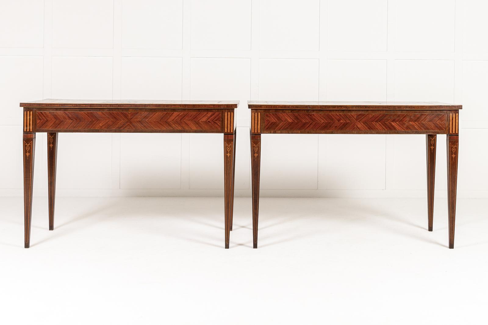 This elegant pair of Italian console tables from the 18th century have distinctive and exquisite kingwood veneers and delicate inlay throughout. The tops are quarter veneered kingwood with chequered inlay and walnut crossbanding and the panelled apron is adorned with the same banding, with the addition of mock fluted blocks to the corners. Raised on slender tapering legs, with foliate motifs in their upper section.