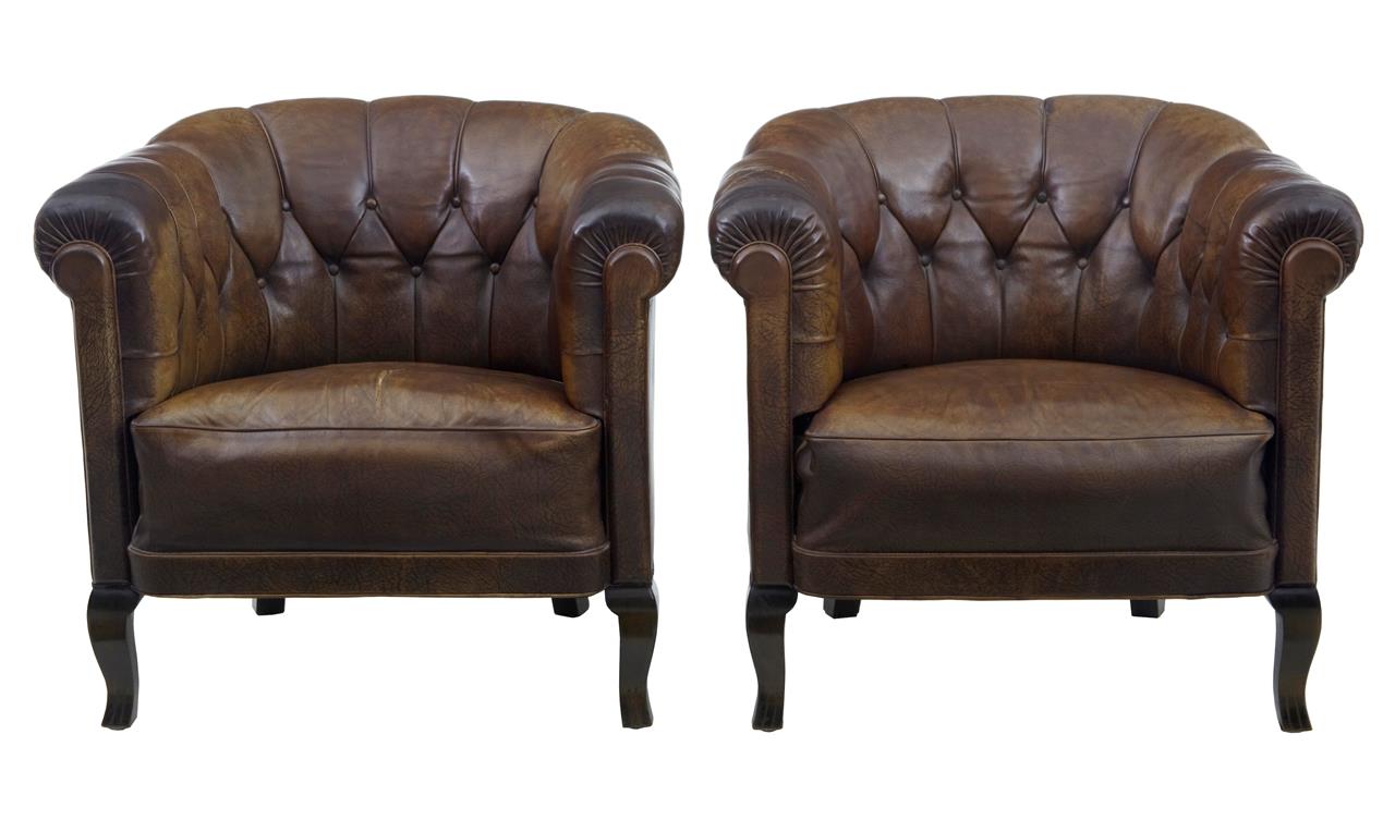 Pair of 1920's Leather Button Back Lounge Armchairs