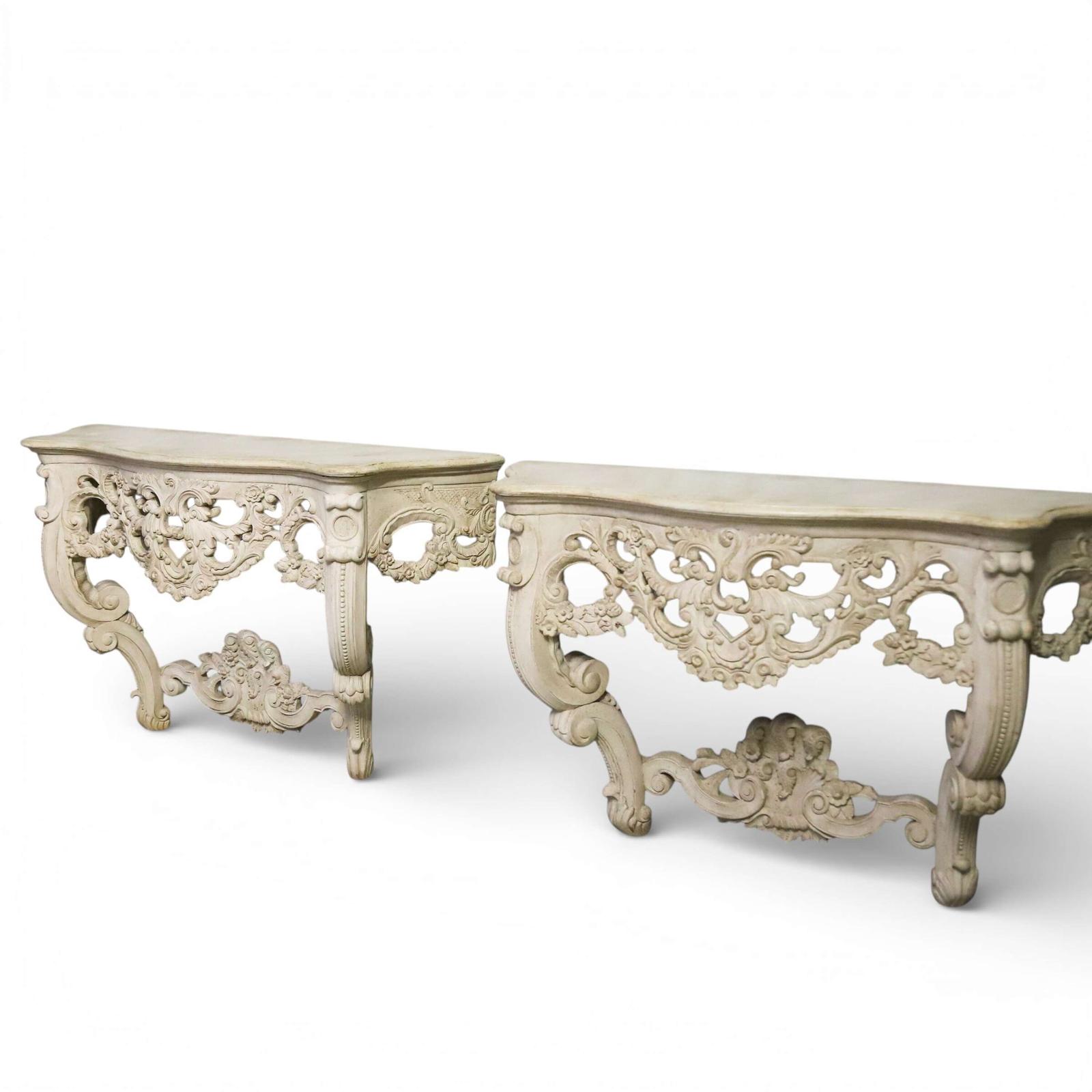 A superb pair of 1930s French wall console tables, richly hand carved and finished in a softly distressed antique white